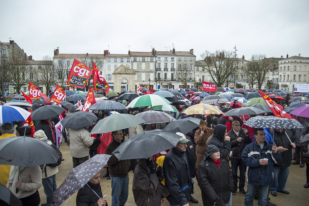 On peut parler d’une forte mobilisation. Plus de 7000 personnes ont défilé dans les principales villes du département. De source syndicalen ils étaient 5 000 manifestants à La Rochelle, un millier à Saintes, 200 à Jonzac, autant à Royan, et 750 à Rochefort. Rochefort où un rassemblement intersyndical s’est tenu sous la pluie place Colbert, mais qui a rencontré autant de succès que lors de la première manifestation le 9 mars. Autant de monde donc, pour des revendications qui ne changent pas. Nicolas Roulin, de l’union locale CGT de Rochefort :