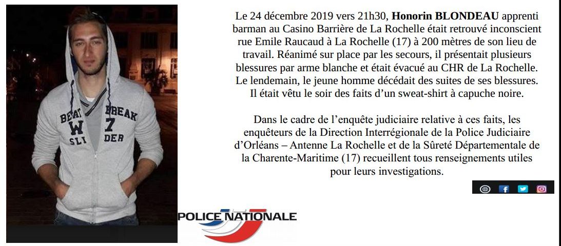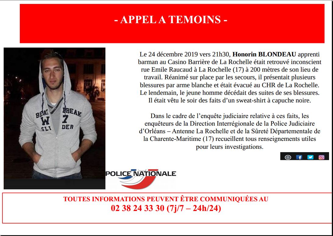 Un appel à témoins a été lancé après la mort suspecte d’un jeune barman le soir du réveillon de Noël à La Rochelle. Le 24 décembre, vers 21h30, Honorin Blondeau, 24 ans, a été retrouvé inconscient rue Emile Raucaud, à 200m du Casino Barrière où il était apprenti. Il présentait trois blessures par arme blanche dont une létale. Malgré les tentatives de réanimation, il succombait quelques temps plus tard à l’hôpital. Le jeune homme portait un sweat à capuche noire le soir des faits. La PJ de La Rochelle cherche à en savoir plus sur les circonstances du drame. Toute information peut être communiquée au 02 38 24 33 30.