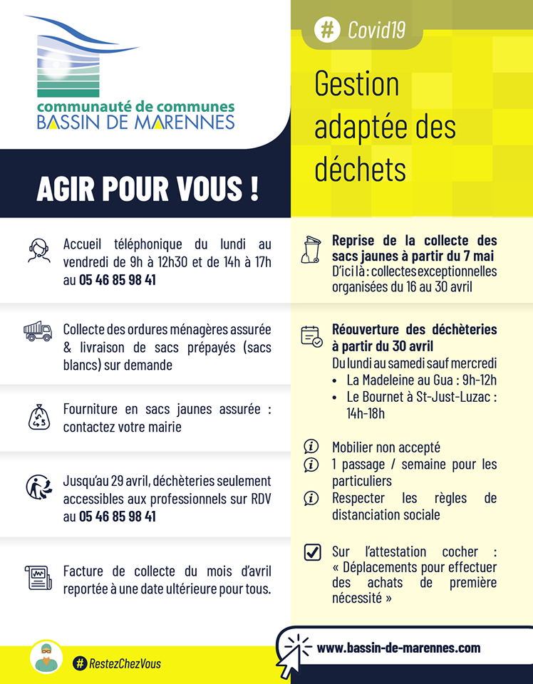 La reprise de la collecte des sacs jaunes dans le Bassin de Marennes. La Régie des déchets de la Communauté de communes annonce que les emballages seront de nouveau ramassés à partir du 7 mai. D’ici là, des collectes exceptionnelles de déstockage continuent d’être organisées dans les communes. Le calendrier est disponible sur le site de la CdC bassin-de-marennes.com