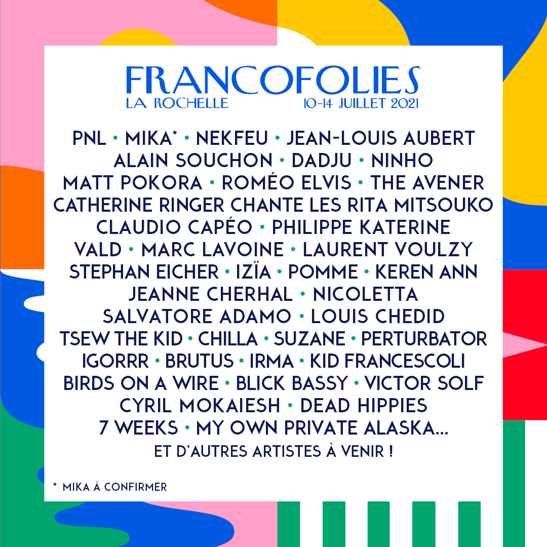 Les organisateurs ont publié hier les noms des chanteurs qui ont confirmé leur participation au festival l’année prochaine, après l’annulation de l’édition 2020 pour cause de crise du covid-19. Parmi eux, Mika, Jean-Louis Aubert, Nekfeu, Alain Souchon, Matt Pokora, Catherine Ringer, Roméo Elvis, Claudio Capéo, Philippe Katerine, Laurent Voulzy, Marc Lavoine, Nicoletta, Salvatore Adamo, Louis Chedid et bien d’autres. Si vous avez déjà acheté des billets pour ces artistes, vous pouvez les conserver pour l’année prochaine et soutenir ainsi le festival, sinon vous pouvez en demander le remboursement. Plus d’infos sur francofolies.fr