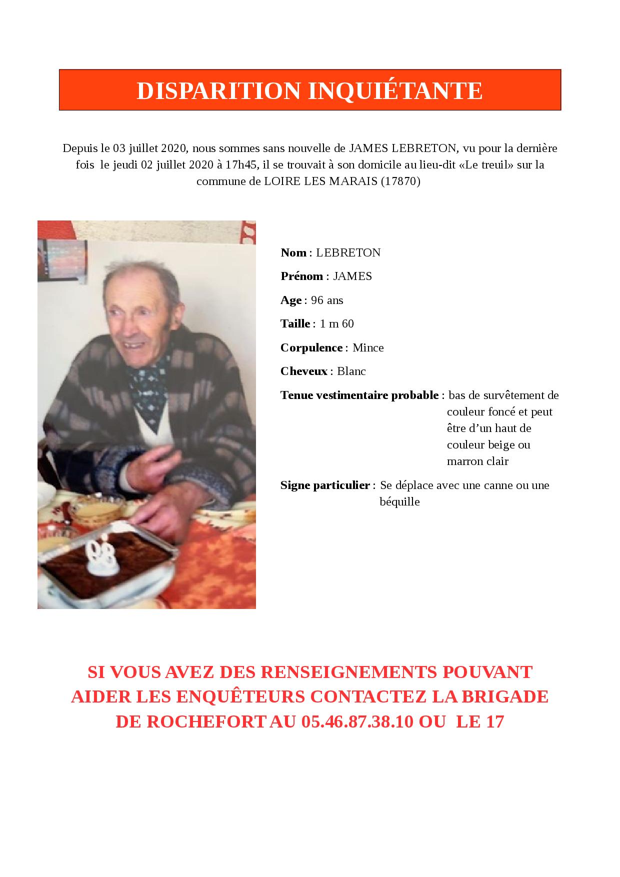 Un appel à témoins a été lancé après une disparition inquiétante à Loire-les-Marais, près de Rochefort. James Lebreton, 96 ans, n’a plus donné signe de vie depuis jeudi dernier. Il a été vu pour la dernière fois à 17h45 à son domicile situé au lieu-dit « Le Treuil ». Malgré les recherches entreprises depuis vendredi et le déploiement d’un important dispositif, l’homme reste introuvable. James Lebreton mesure 1,60m. Il est mince et a les cheveux blancs. Le jour de sa disparition, il portait un bas de survêtement de couleur foncée, et peut-être un haut beige ou marron clair. Il se déplace toujours avec une canne ou une béquille. Si vous avez des renseignements, vous pouvez contacter le 05 46 87 38 10.