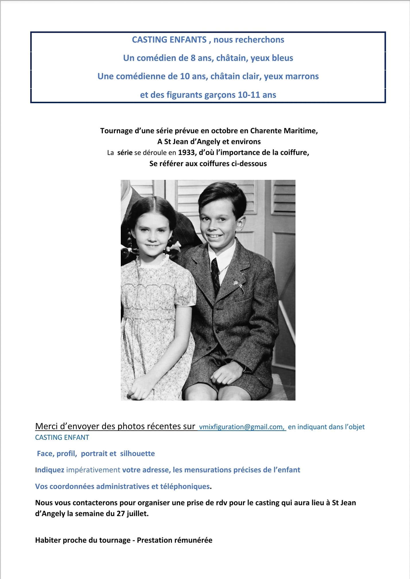 La production est en quête d’un comédien de 8 ans, châtain, aux yeux bleus, et d’une comédienne de 10 ans, châtain clair, les yeux marrons. Ainsi que des figurants garçons de 10-11 ans. Le tournage doit démarrer en octobre. La prestation est rémunérée. Pour postuler, il faut envoyer des photos récentes (de face, de profil, portrait, et silhouette) à vmixfiguration@gmail.com, en indiquant dans l’objet « casting enfant », et indiquer son adresse, les mensurations précises de l’enfant et ses coordonnées. Le casting est prévu la semaine prochaine.