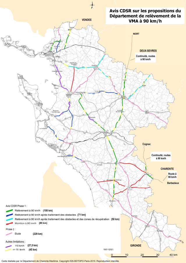 La vitesse relevée à 90km/h sur certains axes en Charente-Maritime. Dès le mois prochain, 108 kilomètres de routes seront concernés par cette mesure. La Commission départementale de la sécurité routière a approuvé ce retour à 90km/h, après une étude portant sur 309km de voirie. Un changement de signalisation sera nécessaire au préalable. Après réalisations des travaux, ce sont 121km de route qui passeront de 80 à 90km/h entre la fin de cette année et 2022. Lucie Alix :