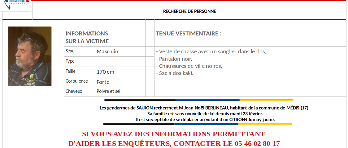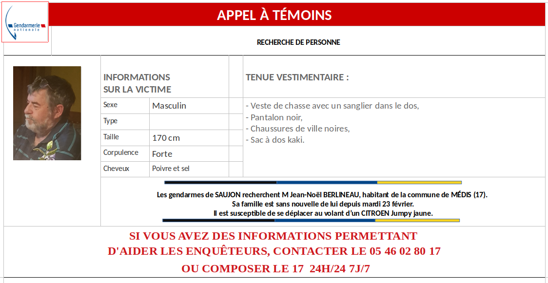 La disparition inquiétante d’un homme de 62 ans à Médis, près de Royan. Jean-Noël Berlineau n’a plus donné signe de vie depuis mardi dernier. Il a quitté son domicile ce jour-là dans la matinée. Et depuis, plus de nouvelles. Sa famille est très inquiète. La gendarmerie de Saujon a lancé un appel à témoins. Jean-Noël Berlineau mesure 1,70m, est de forte corpulence et a les cheveux poivre et sel. Le jour de sa disparition, il portait un pantalon noir, des chaussures noires et une veste de chasse avec un sanglier dans le dos. Il avait un sac à dos kaki et aurait pris la route à bord d’une Citroën Jumpy jaune. Si vous pensez l’avoir aperçu, vous pouvez contacter le 05 46 02 80 17.