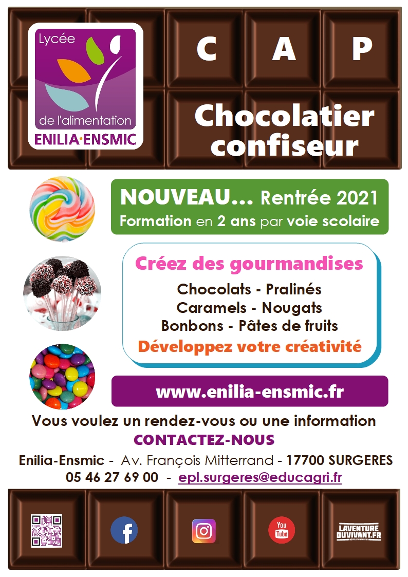 Une nouvelle offre de formation à l’Enilia-Ensmic de Surgères. Avis aux gourmands. Dès septembre, le lycée de l’alimentation proposera un CAP chocolatier/confiseur aux jeunes sortant de 3e. Un apprentissage en deux ans qui donne envie, quelques jours après les fêtes de Pâques. Les précisions de Lucie Alix :