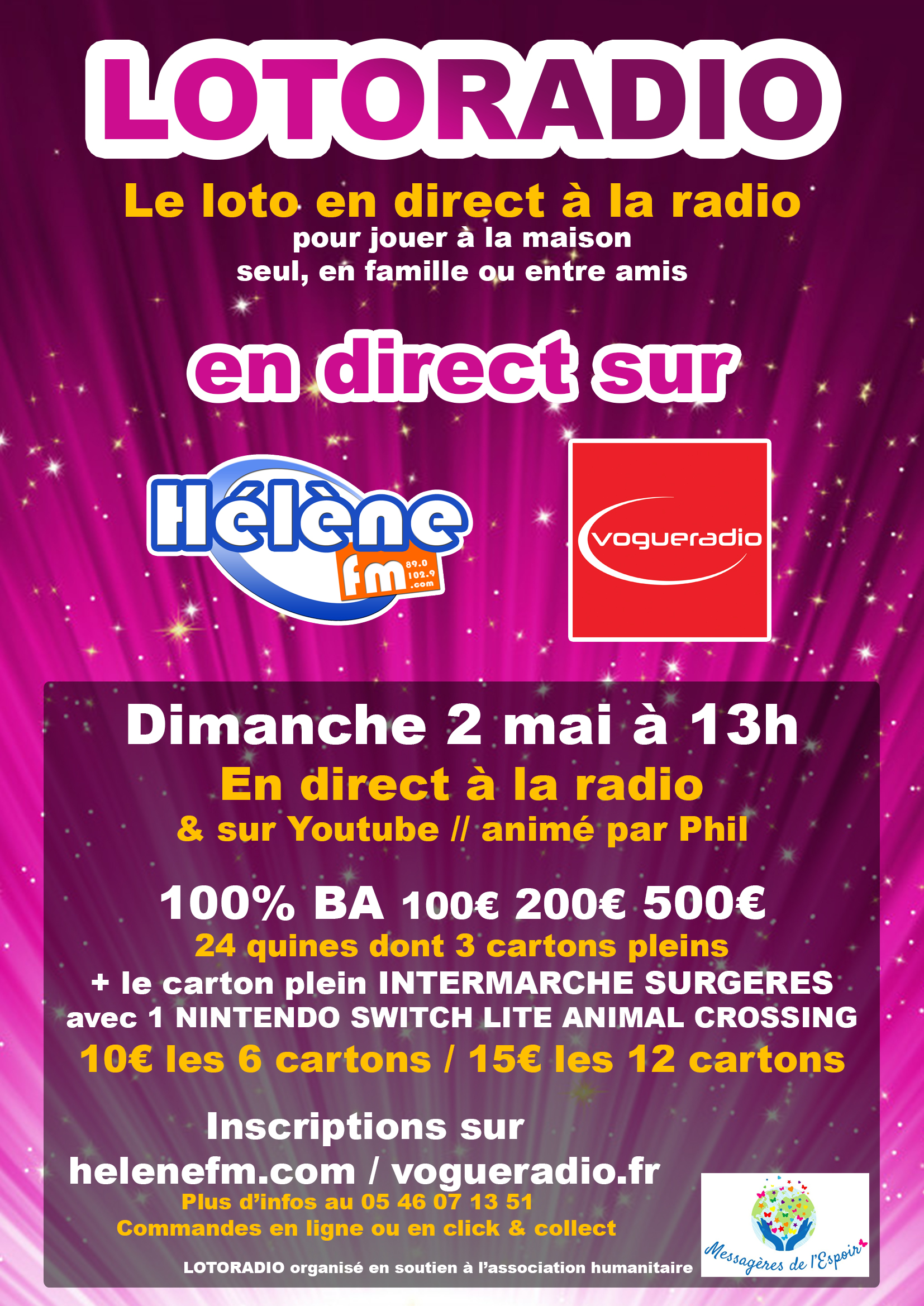 3 – Et dimanche 2 mai à 13h, suivez le tirage en direct à la radio sur Hélène FM et Vogue radio, et en vidéo sur Youtube https://www.youtube.com/watch?v=MQF6ugSw6RY (connexion possible dès 12h30)