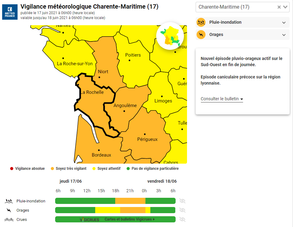 La Charente-Maritime est de nouveau placée en vigilance orange pour le risque d’orages, mais aussi et surtout en raison du risque pluie-inondation. Le temps va rester encore assez tumultueux ce jeudi dans notre département, avec la présence d’orages localisés, accompagnés d’un risque de chute de grêle en fin de journée. Le temps est gris et humide, avec de fortes précipitations cet après-midi et en soirée. Ça devrait se calmer demain vendredi, avant le retour d’un ciel tourmenté samedi et dimanche. Côté mercure, ça redevient enfin plus respirable avec une moyenne de 20° ce matin. Ça ne devrait pas dépasser les 23° cet après-midi sur le littoral et 24° dans les terres. Le vent va se renforcer avec des rafales à 80km/h cet après-midi.