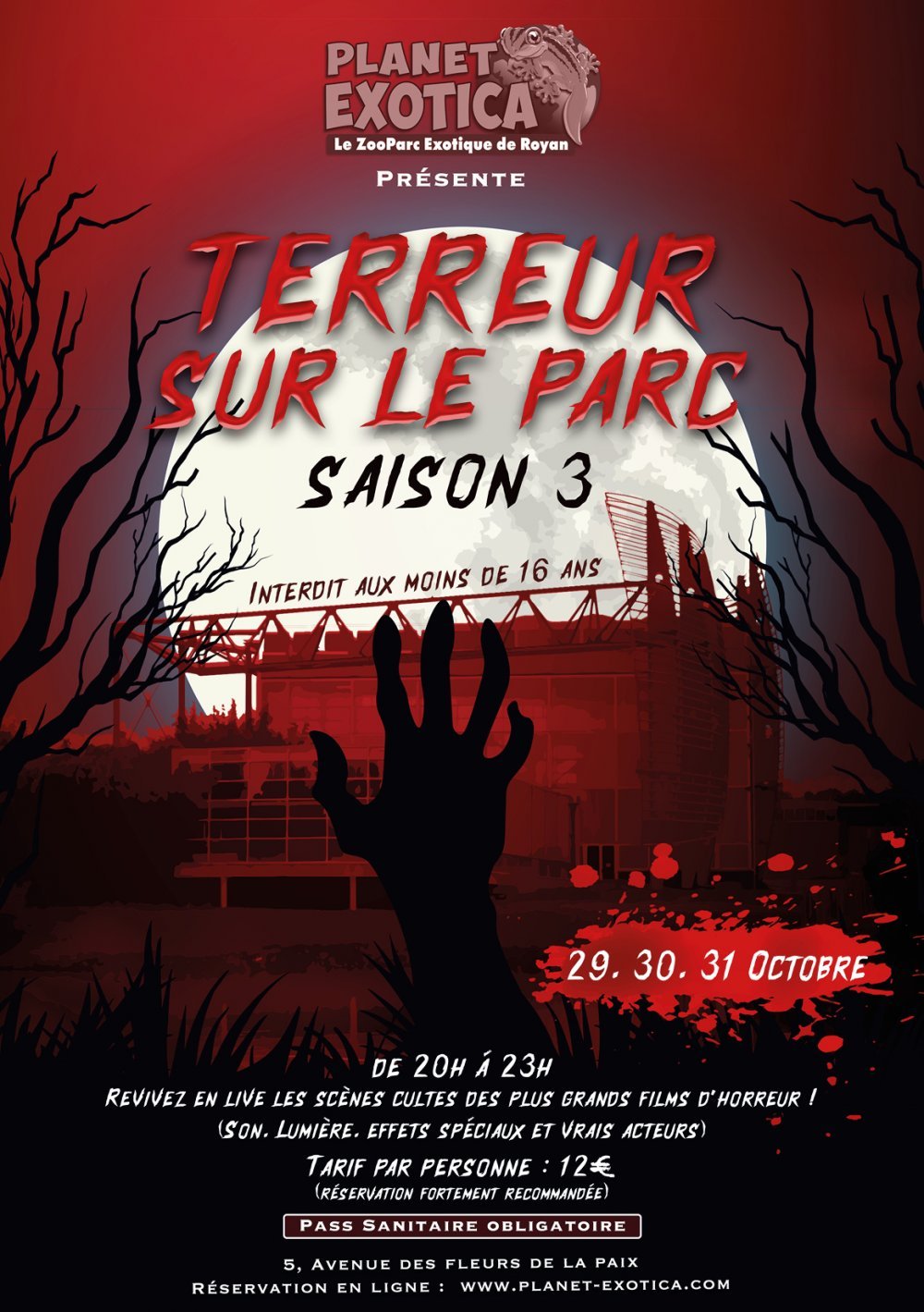 Du 29 au 31 octobre, le parc animalier se met à l’heure d’Halloween. A la tombée de la nuit, les visiteurs sont invités à venir revivre les scènes cultes des plus grands films d’horreur, avec la saison 3 de « Terreur sur le parc ». Après une première édition réussie en 2019, un peu moins l’an dernier en raison du contexte sanitaire, l’événement revient. Et les organisateurs ont vu les choses en grand cette année, avec sons, lumières, effets spéciaux et comédiens comme le souligne le directeur de Planet Exotica Marc Jaeger :