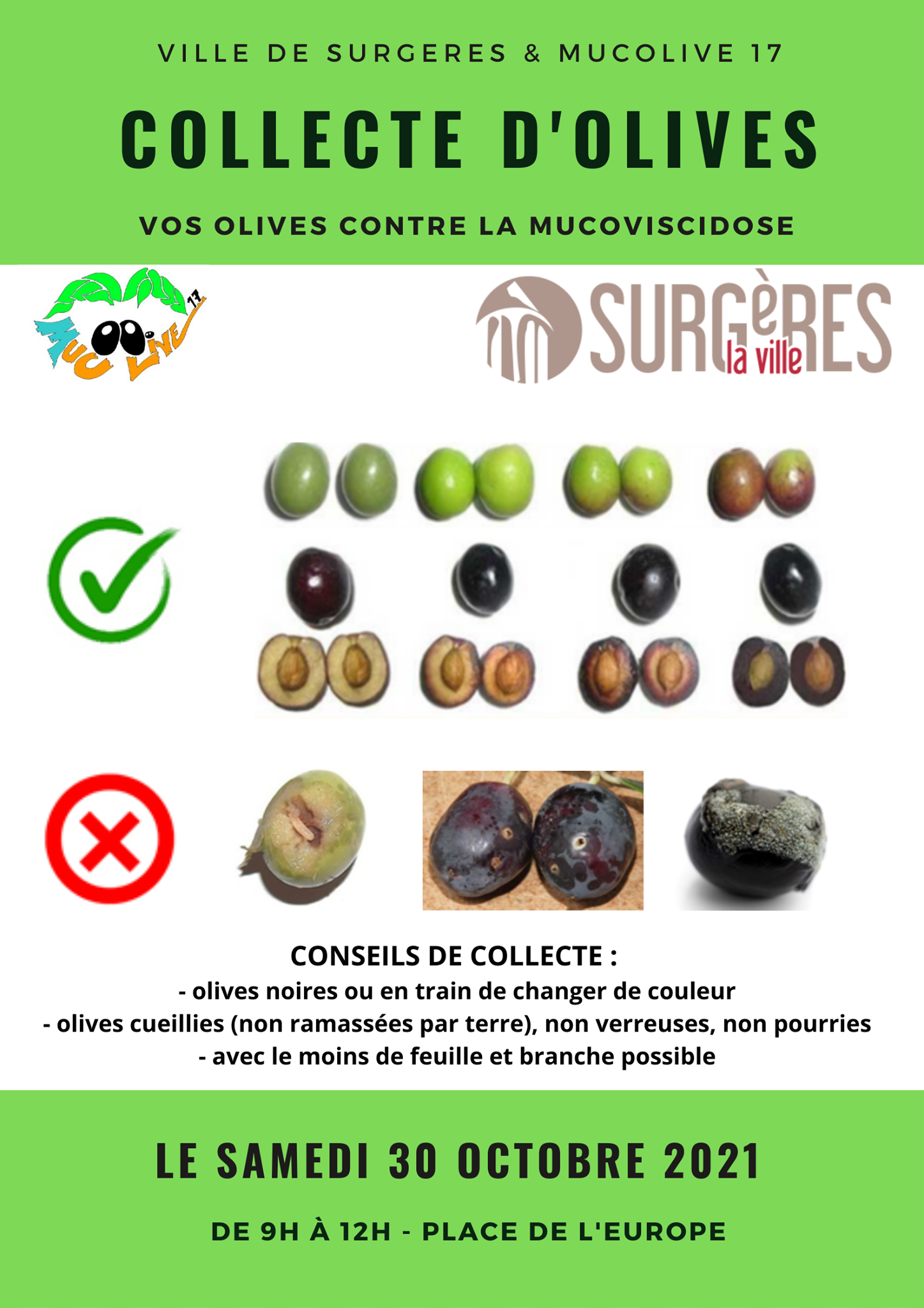 Rendez-vous donc samedi de 9h à midi place de l’Europe à Surgères pour cette opération de collecte d’olives au profit de la lutte contre la mucoviscidose.