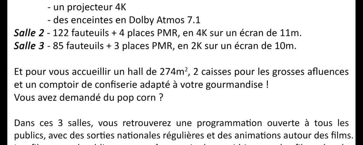L’équipement représente plus de 460 places au total, avec tout le confort, un son dolby atmos, des écrans 4K et des films pour tous les goûts avec des sorties nationales comme le dernier Spider-man dès mercredi, et des avant-premières comme « Tous en scène 2 » dimanche à 16h30. De quoi contenter tous les amoureux du 7e art, mais aussi limiter l’évasion et dynamiser le territoire :