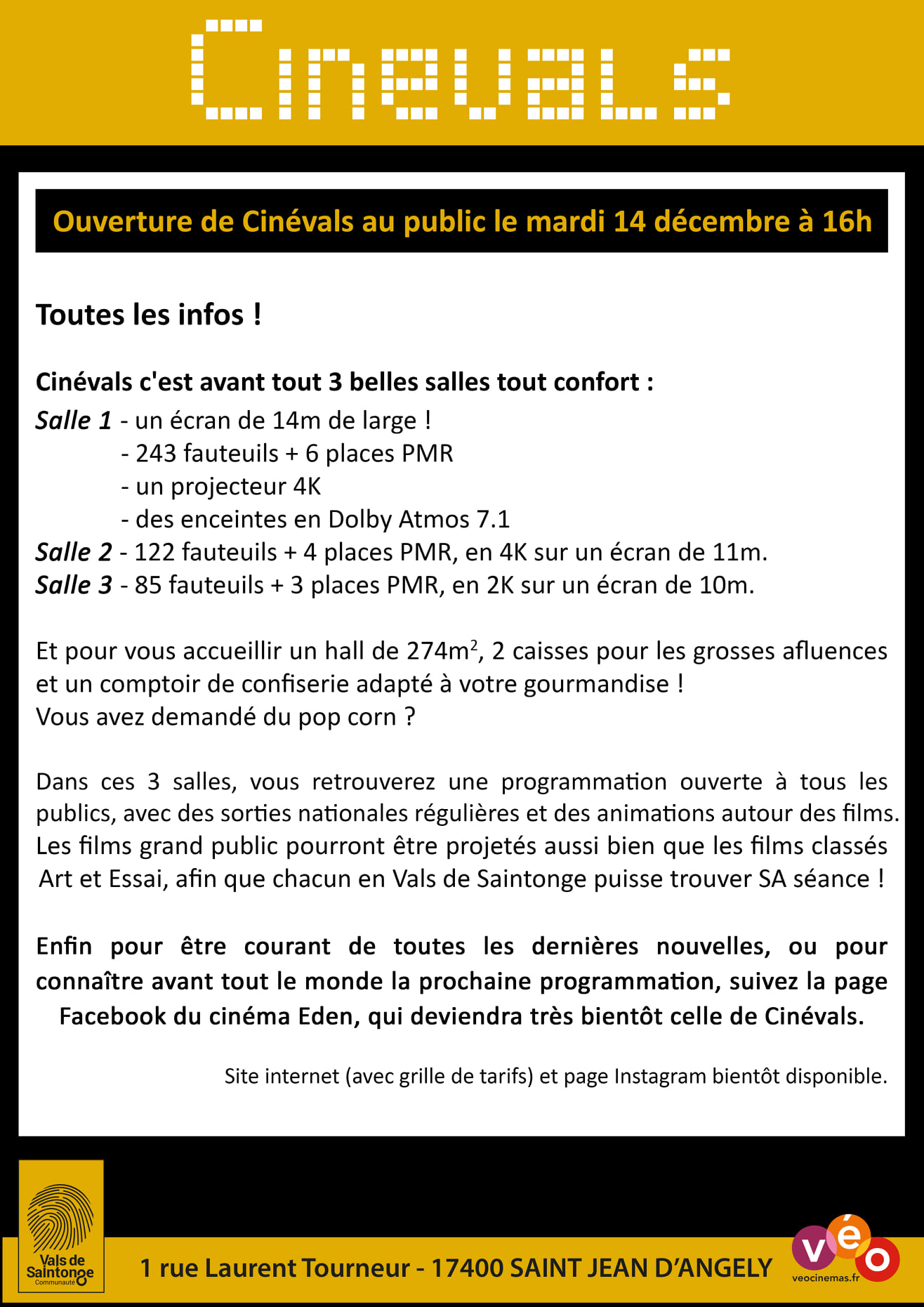 Evènement ce soir à Saint-Jean-d’Angély avec l’inauguration du tout nouveau complexe Cinévals. Un cinéma de trois salles, créé par la Communauté de communes des Vals de Saintonge en plein cœur de ville, face aux futurs Thermes. L’aboutissement d’un projet vieux de plus de 20 ans, comme le rappelle le président de la CdC Jean-Claude Godineau :