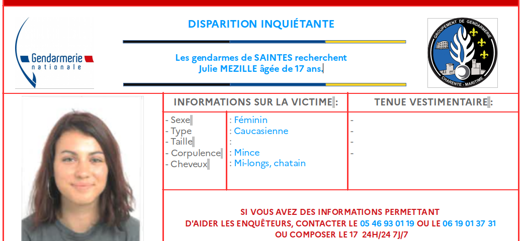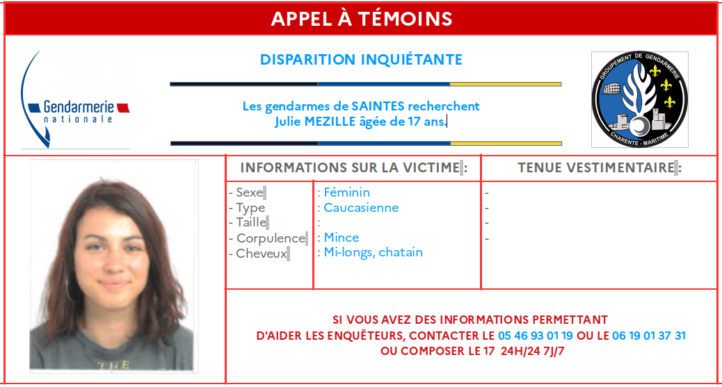 La gendarmerie de Saintes lance un appel à témoins pour retrouver une jeune fille de 17 ans. Elle s’appelle Julie Mézille. Elle a les cheveux mi-longs châtains. Elle est mince, de type caucasien. Une enquête pour disparition inquiétante a été ouverte. Si vous avez des informations pour retrouver la trace de la jeune fille, vous pouvez contacter la gendarmerie de Saintes au 05 46 93 01 19 ou le 06 19 01 37 31. Ou bien encore le 17 accessible 24h/24 et 7j/7.