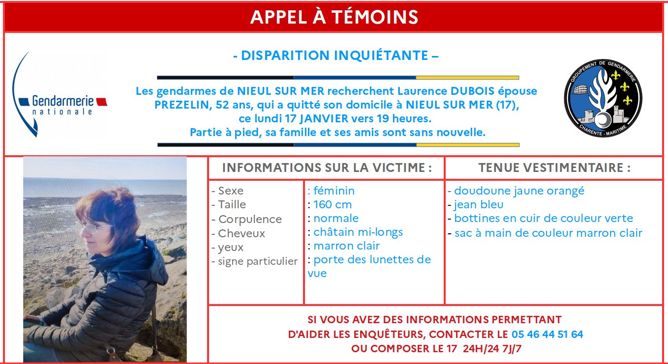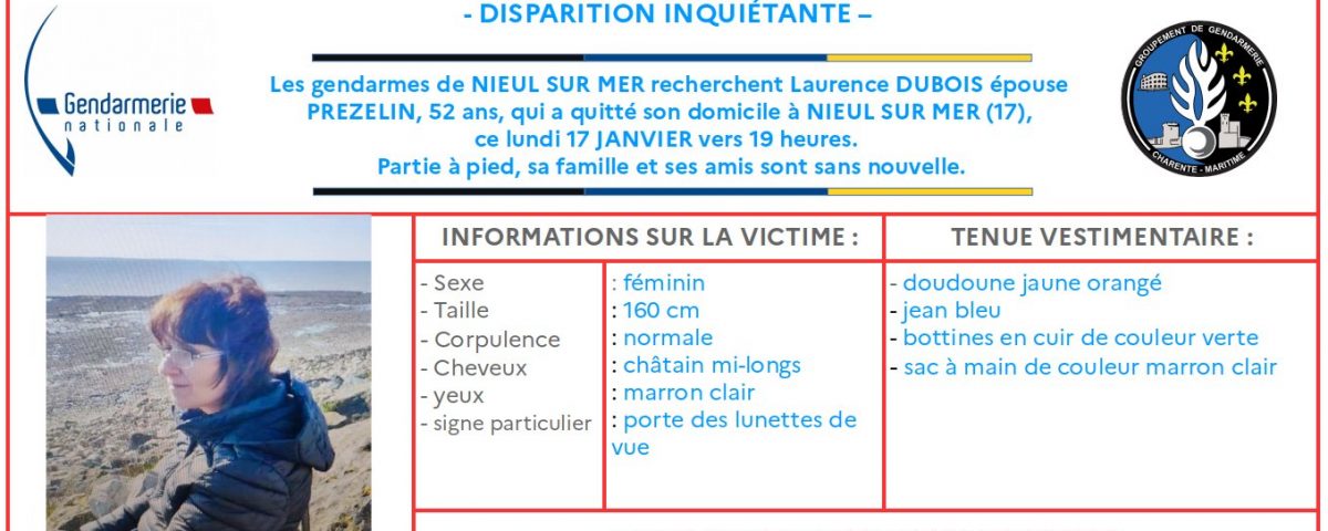 La disparition inquiétante d’une femme de 52 ans à Nieul-sur-Mer, près de La Rochelle. Laurence Prézelin, née Dubois, a quitté son domicile à pied, lundi soir vers 19h. Depuis, sa famille et ses amis sont sans nouvelle d’elle. Les gendarmes lancent un appel à témoins dans l’espoir de la retrouver. La disparue a les cheveux châtains mi-longs, elle mesure 1,60m, elle est de corpulence normale. Elle a les yeux marron clair et porte également des lunettes de vue. Elle portait le jour de sa disparition un jean bleu, des bottines en cuir de couleur verte, une doudoune jaune orangé et un sac à main marron clair. Si vous avez des informations, vous pouvez contacter le 05 46 44 51 64 ou le 17.