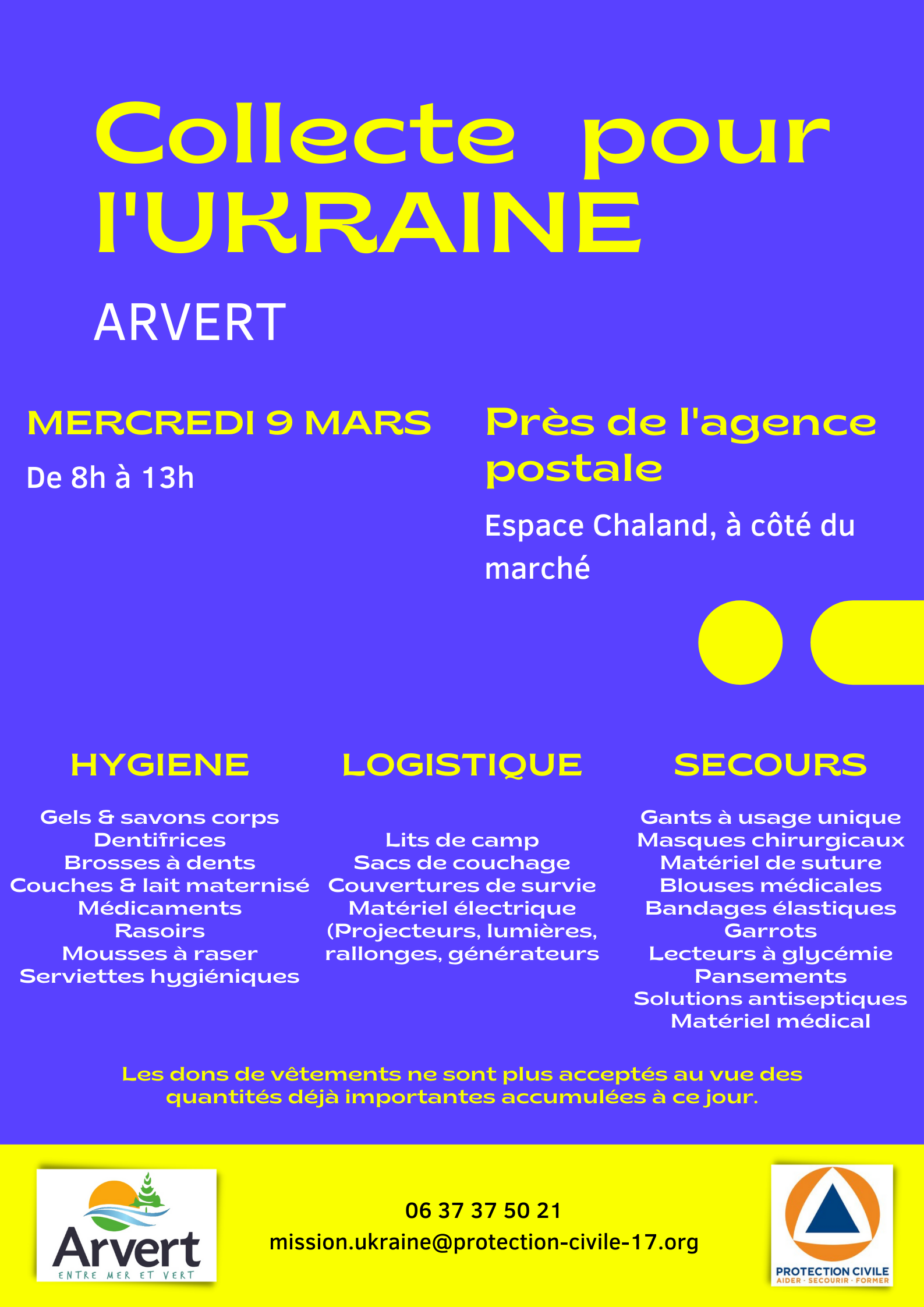 Arvert se mobilise également pour l’Ukraine. La commune organise ce mercredi une collecte exceptionnelle de dons de matériels sur le marché. Elle précise que les dons de vêtements ne sont plus acceptés en raison des quantités déjà importantes accumulées à ce jour. Rendez-vous toute cette matinée jusqu’à 12h30.