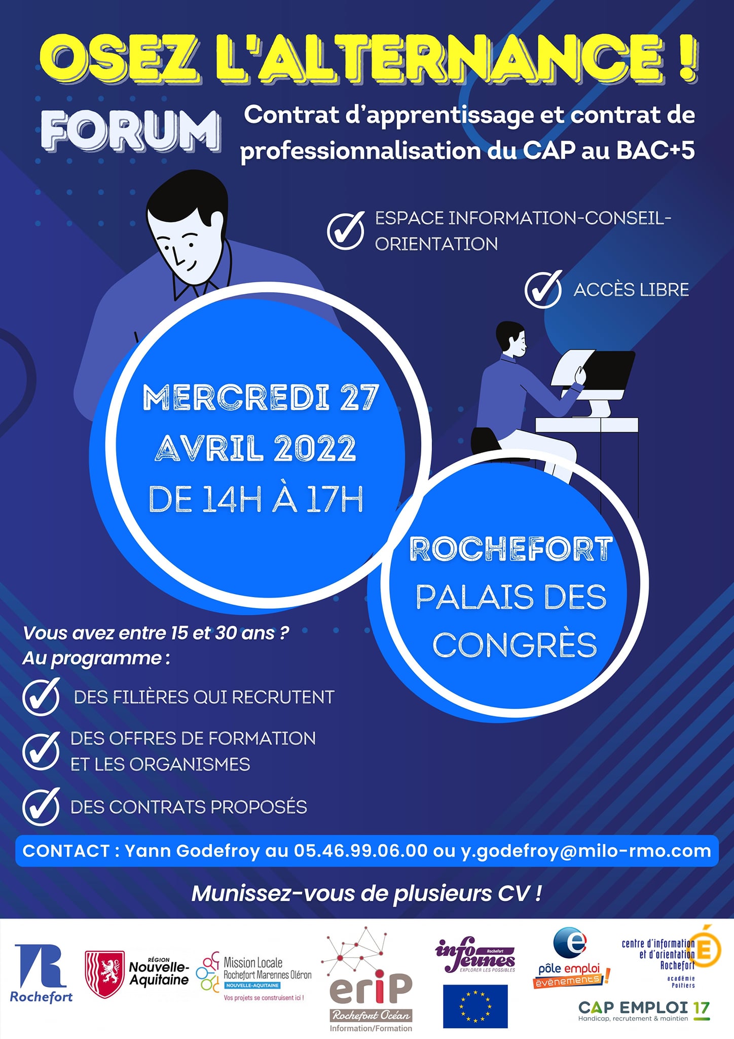 Des centaines d’offres en alternance à pourvoir cet après-midi à Rochefort. Un forum spécialement consacré aux 15-30 ans a lieu ce mercredi au Palais des congrès. Une trentaine d’organismes de formation et des employeurs seront présents pour informer les jeunes en recherche d’un contrat d’apprentissage ou de professionnalisation. Le rendez-vous est donné de 14h à 17h. Munissez-vous de plusieurs CV.