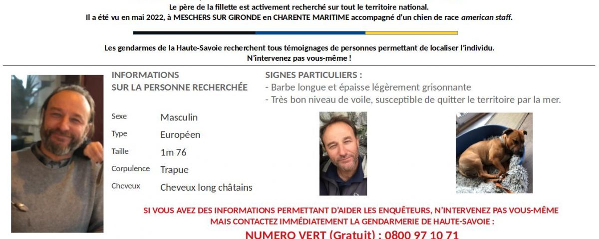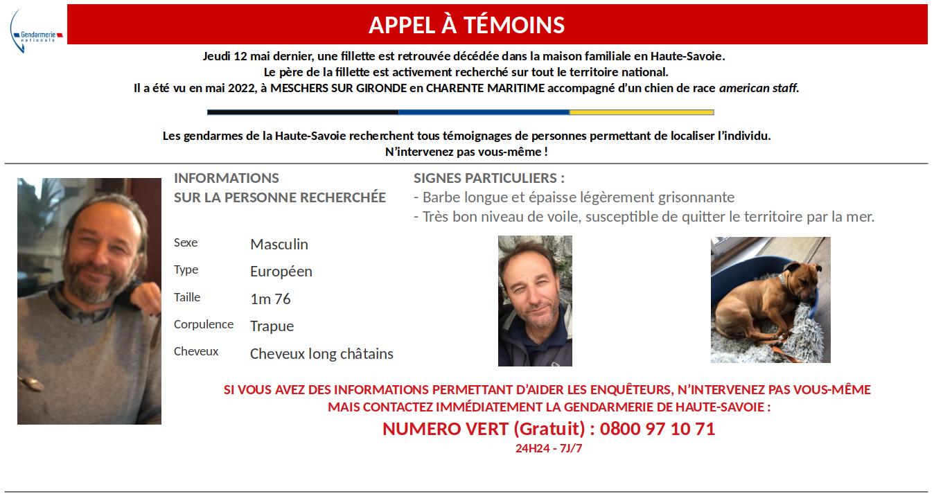 La gendarmerie de la Charente-Maritime relaie un appel à témoins pour retrouver un père de famille suspecté d’avoir tué sa fille de 10 ans. Cette dernière a été retrouvée morte asphyxiée le 12 mai dernier à son domicile, en Haute-Savoie. Le meurtrier présumé, qui est activement recherché sur tout le territoire national, a été vu en mai dernier à Meschers-sur-Gironde, près de Royan, accompagné d’un chien de race American staff. L’homme est de type européen, trapu, mesure 1,76m, a les cheveux longs châtains. Il porte une barbe longue et épaisse, légèrement grisonnante. D’un très bon niveau de voile, il est susceptible de quitter le territoire par la mer, précisent les forces de l’ordre. Si vous avez des informations permettant de le localiser, n’intervenez pas vous-même et contacter immédiatement la gendarmerie de Haute-Savoie au 0 800 97 10 71.