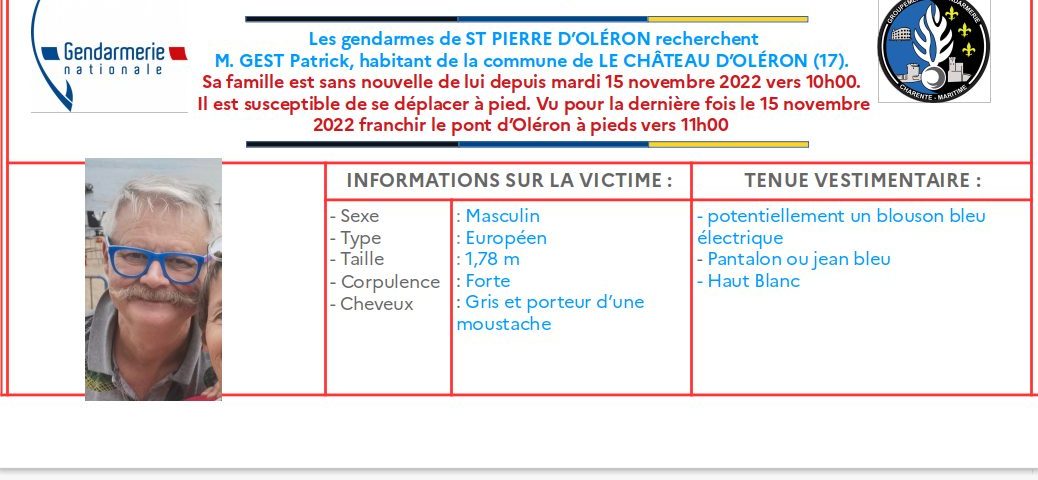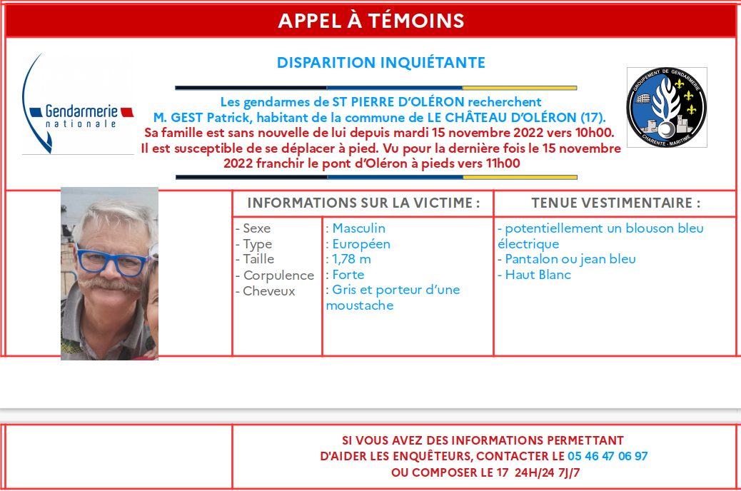 La gendarmerie lance un appel à témoins suite à la disparition inquiétante d’un habitant du Château-d’Oléron. Patrick Gest, 63 ans, n’a plus donné signe de vie depuis hier matin, 10h. Sa famille est sans nouvelle de lui. La dernière fois qu’il a été vu, c’était aux alentours de 11h sur le pont de l’île d’Oléron. Il était à pied. L’homme de type européen mesure 1,78m, est de forte corpulence, a les cheveux gris et porte une moustache. Il serait vêtu d’un blouson bleu électrique, d’un pantalon ou d’un jean bleu et d’un haut blanc. Si vous avez des informations pouvant aider les enquêteurs, vous pouvez contacter la brigade de gendarmerie de Saint-Pierre-d’Oléron au 05 46 47 06 97.