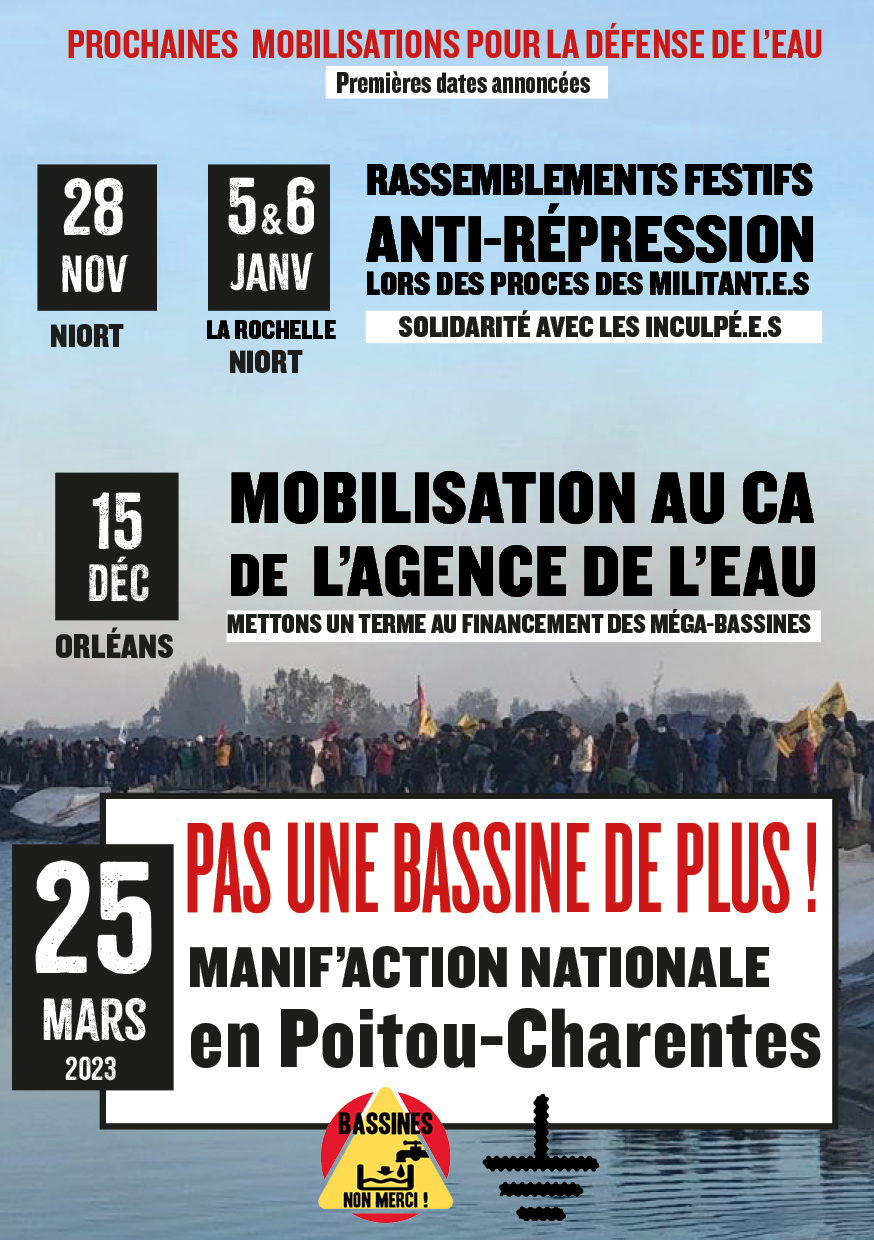 Les anti-bassines se préparent à une mobilisation historique. Elle aura lieu le 25 mars prochain en Poitou-Charentes, cinq mois après la manifestation interdite de Sainte-Soline, dans les Deux-Sèvres. Les opposants aux réserves d’eau agricole ont annoncé hier à Niort un « printemps poitevin », tout en dévoilant le calendrier des prochaines manifestations : le 28 novembre devant le tribunal de Niort où cinq manifestants de Sainte-Soline doivent être jugés ; le 15 décembre à l’Agence de l’eau Loire Bretagne à Orléans contre le financement public des bassines ; et les 5 et 6 janvier, deux rassemblements à Niort et La Rochelle en soutien à des militants convoqués devant la justice.