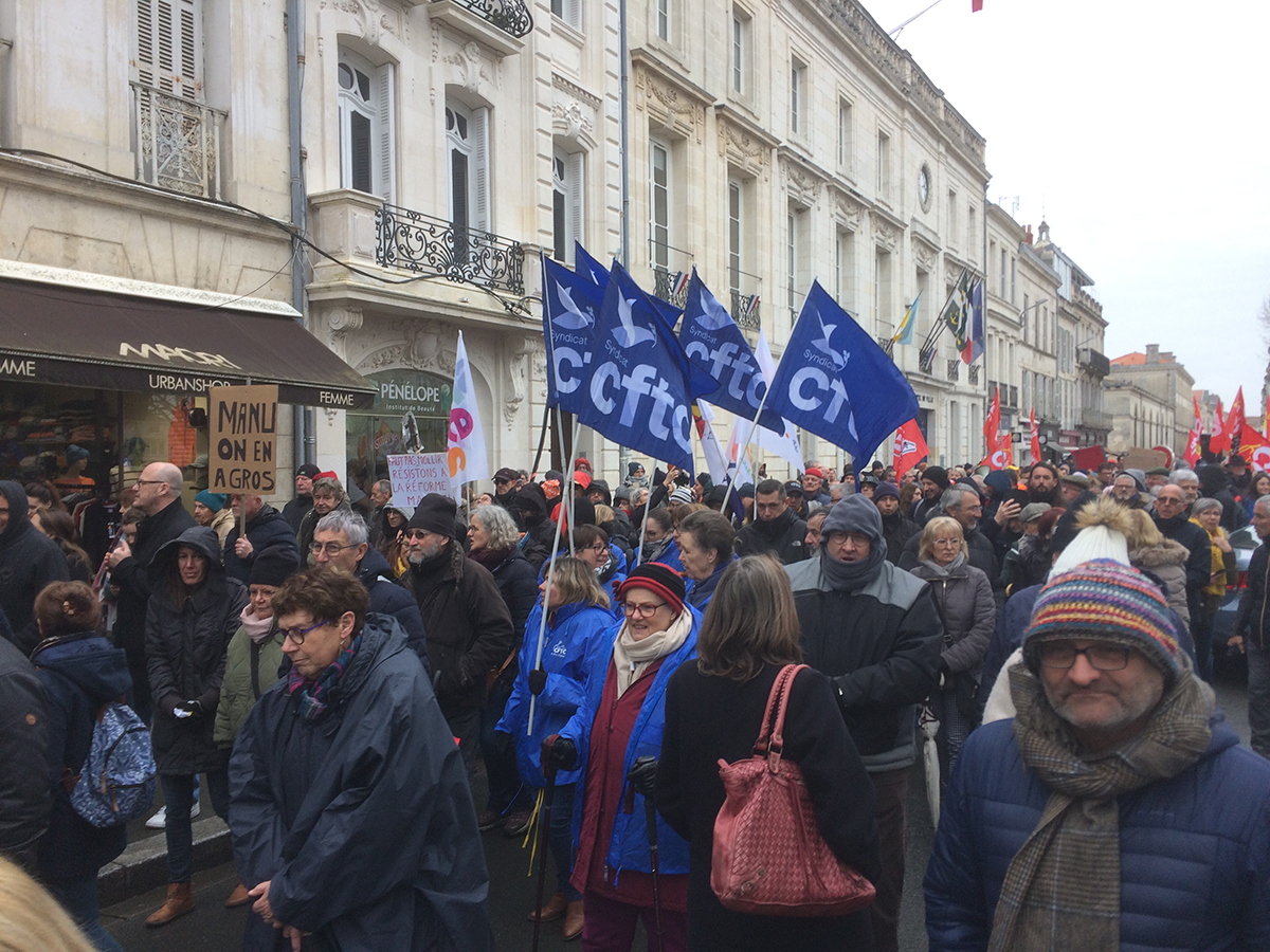 Plusieurs milliers de manifestants ont défilé cet après-midi à La Rochelle. Ce matin, ils étaient plus de 5 000 à Saintes, selon les syndicats. Environ 4 000 selon les forces de l’ordre. Et quasiment autant à Rochefort. Du jamais vu depuis le début du mouvement entamé le 19 janvier dernier. Tous n’ont pas hésité à braver la pluie pour redire leur opposition à cette réforme, à l’image de Claude Leroy, secrétaire général Force ouvrière Rochefort-Marennes-Oléron :