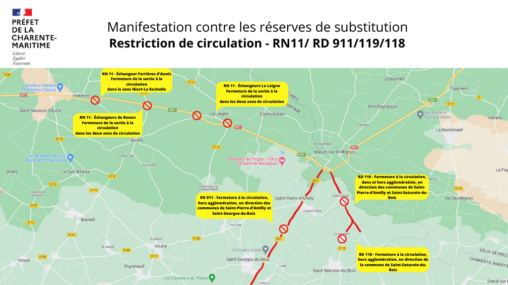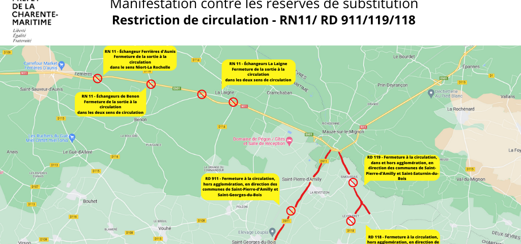 L’appel à une manifestation d’ampleur internationale contre les bassines demain dans le sud des Deux-Sèvres. En Charente-Maritime, la préfecture a pris une série de mesures cette semaine pour éviter tout risque de débordements, comme des interdictions de manifestations et d’attroupements dans plusieurs communes de l’Aunis ce week-end. Hier, un arrêté a été pris concernant des restrictions de circulation entre La Rochelle et Niort. Et plus précisément dans les secteurs de Ferrières, Benon et Saint-Pierre-d’Amilly. Des opposants aux réserves d’eau agricole ont en effet prévu de partir en convoi de La Rochelle afin de rejoindre les lieux de manifestation à Mauzé-sur-le-Mignon et Sainte-Soline.