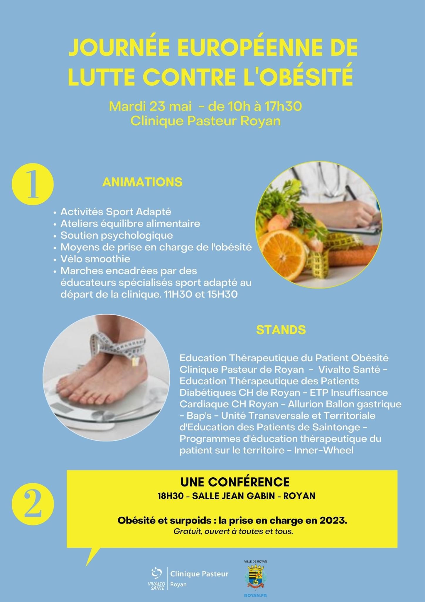 Deux temps forts sont prévus ce mardi à la Clinique Pasteur de Royan. Des stands et des animations sont proposés de 10h à 17h30, avec des activités de sport adapté et d’équilibre alimentaire. Ainsi que deux marches à 11h30 et 15h30. Puis à 18h30, une conférence est organisée à la salle Jean-Gabin sur le thème « Obésité et surpoids : la prise en charge en 2023 », animée par différents intervenants, chirurgiens et spécialistes. Cette journée est gratuite et ouverte à tous.