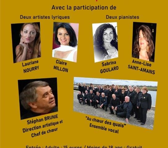 Rendez-vous ce dimanche 11 juin à Tonnay-Charente pour un concert exceptionnel au complexe municipal. Sur scène quarante choristes, deux artistes lyriques Laurianne Nourry et Claire Millon, deux pianistes Sabrina Goulard et Anne-Lise Saint-Amans, ainsi que l’ensemble vocal Au chœur des quais. Le tout sous la direction artistique et chef de cœur Stéphan Brunie. Tarif adulte 15€ et gratuit pour les moins de 18 ans. Début du concert à 17h. Réservation indispensable au 05 46 83 26 79, à l’École de musique et de danse et sur Helloasso.