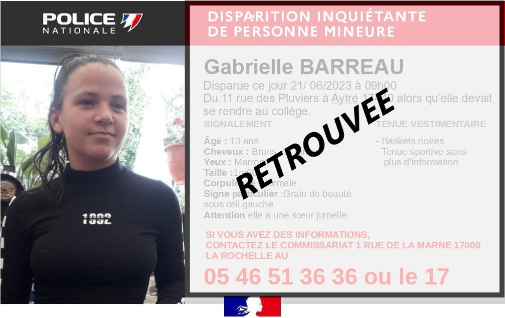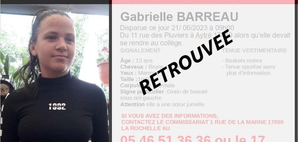 L’adolescente de 13 ans portée disparue depuis hier à Aytré, près de La Rochelle, a été retrouvé. La police avait lancé un appel à témoins après la disparition inquiétante de Gabrielle qui n’avait plus donné de nouvelles depuis qu’elle avait quitté son domicile vers 9h, alors qu’elle devait se rendre au collège.