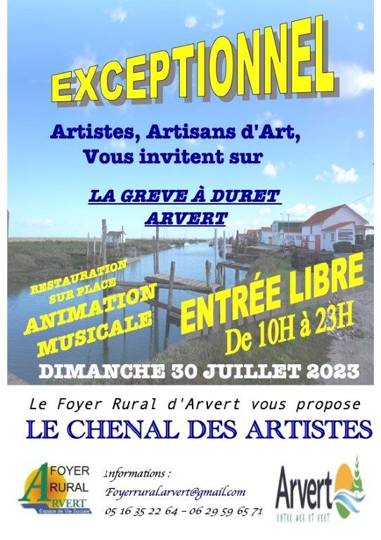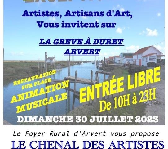 À Arvert, le Foyer rural vous propose « Le chenal des artistes » dimanche 30 juillet, de 10h à 23h, à La Grève à Duret. Venez rencontrer les artistes, artisan d’art (sculptures, peintures, photos, céramiques, bois flotté, bijoux, maroquinerie, luminaires). L’entrée est libre. Restauration sur place et animation musicale avec les groupes Zinamid, Zig’O Mathik, Mido, BBcoolsong et Alicia. Renseignements au 05 16 35 22 64 ou au 06 29 59 65 71 et sur foyeruralarvert@gmail.com.