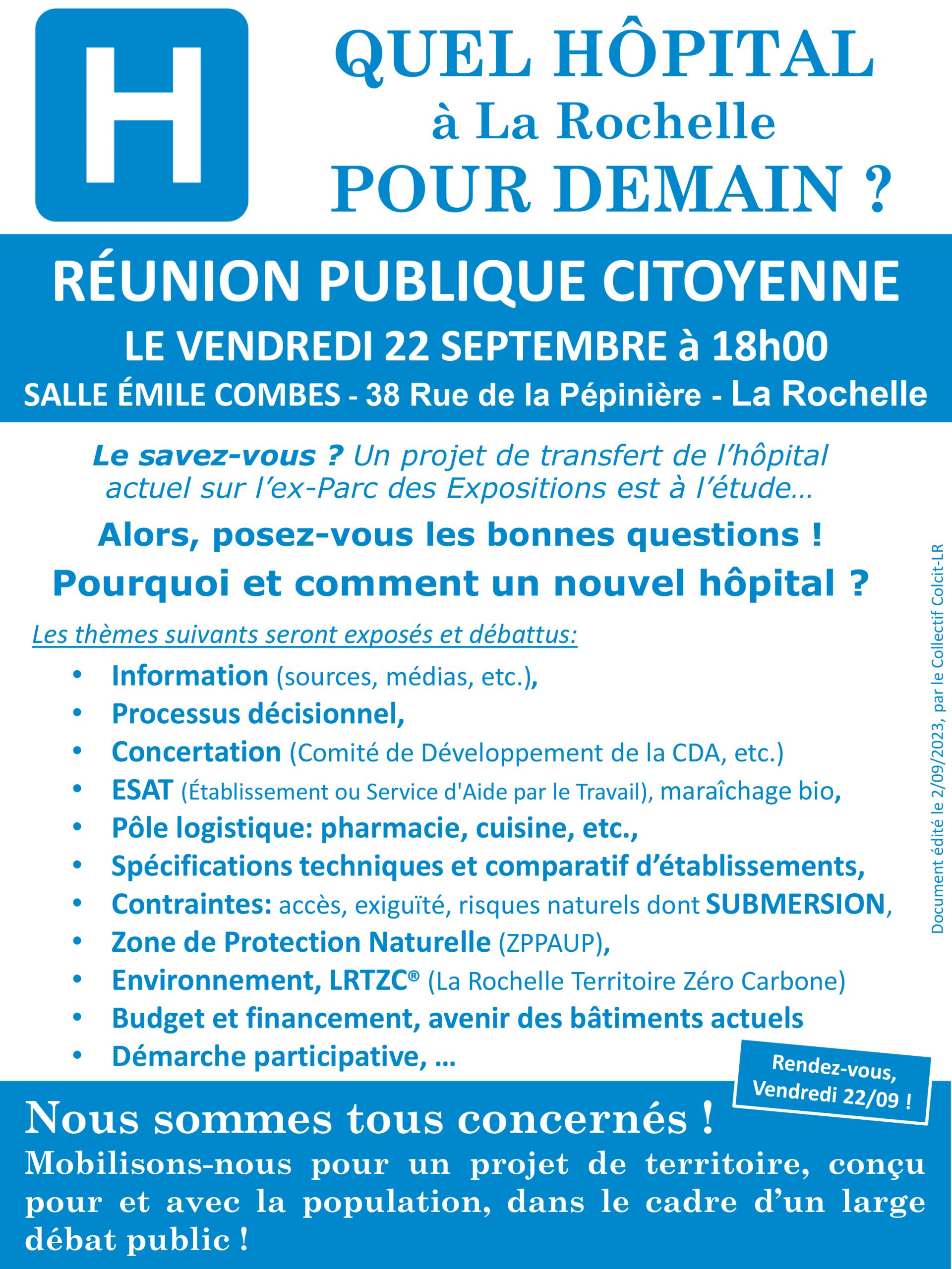 Le transfert et l’aménagement du futur hôpital de La Rochelle au Parc des expositions en question ce soir. Une réunion publique est organisée à l’initiative du collectif citoyen Colcit-LR. Elle a pour thème : « quel hôpital à La Rochelle pour demain ? ». Alors que les enjeux sont importants autant que les interrogations sont nombreuses, notamment sur le coût qui serait passé de 200 à 750 millions d’euros, les réponses manquent, selon Jean Hesbert du collectif :