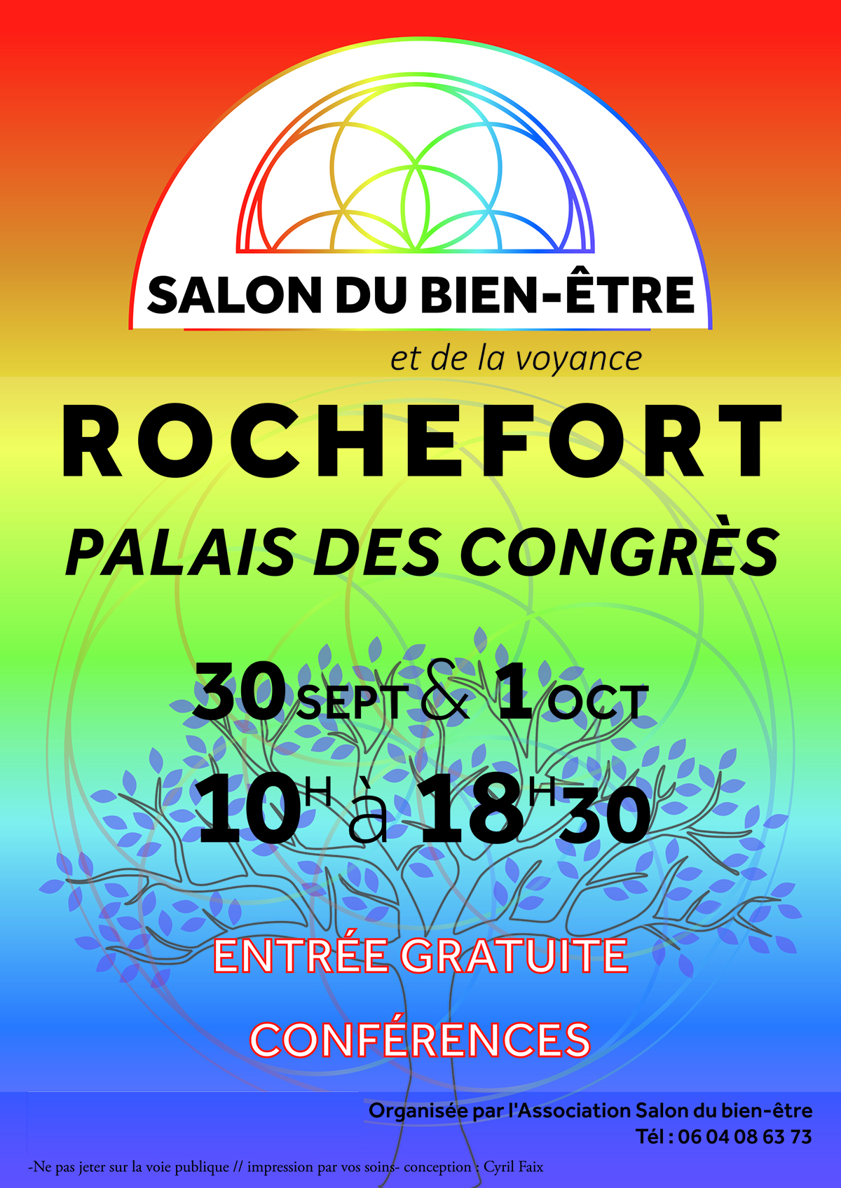 Rendez-vous au Salon du bien-être et de la voyance samedi 30 septembre et dimanche 1er octobre, au palais des congrès de Rochefort. Ouvert de 10h à 18h30. 48 exposants seront présents pour vous conseiller sur votre bien-être, massage, minéraux, kinésiologie, voyances et bien d’autres. Conférences et entrée gratuites. Renseignements au 06 04 08 63 73.