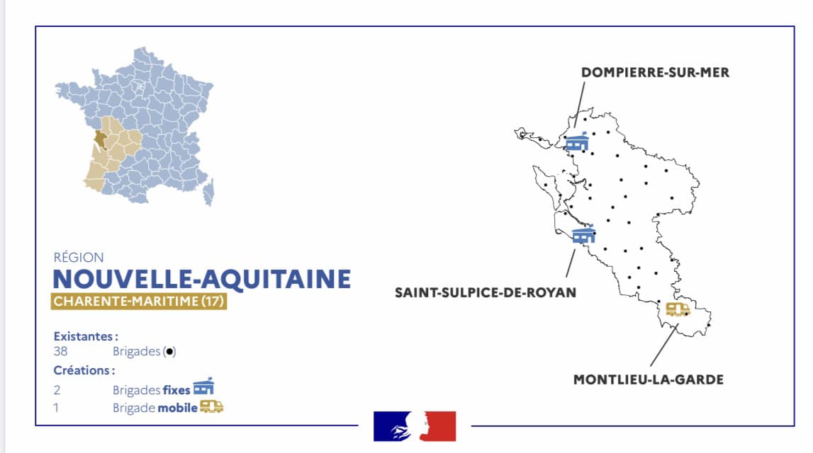 238 nouvelles brigades de gendarmerie vont voir le jour d’ici quatre ans en France. La liste a été dévoilée hier après-midi à Tonneins, dans le Lot-et-Garonne, à l’occasion d’un déplacement du Président Emmanuel Macron. L’État souhaite un meilleur maillage du territoire, notamment dans les zones péri-urbaines délaissées et dans les secteurs en pleine explosion démographique, alors que près de 500 brigades avaient été supprimées au début des années 2000. En Charente-Maritime, trois projets ont été retenus. Deux brigades fixes seront créées dans le département : l’une à Dompierre-sur-Mer, près de La Rochelle, et l’autre à Saint-Sulpice-de-Royan, alors que le choix des élus locaux s’était finalement porté sur la commune de Breuillet. Une dernière brigade, cette fois mobile, sera implantée à Montlieu-la-Garde. Ces nouvelles gendarmeries proposeront aux habitants des services tels que l’accueil du public, des victimes, la prise de plainte et renforceront la présence des forces de l’ordre sur l’ensemble du territoire. Elles viendront renforcer les 38 brigades de gendarmerie déjà existantes. Une excellente nouvelle dont s’est réjouie la présidente du Département de la Charente-Maritime Sylvie Marcilly.