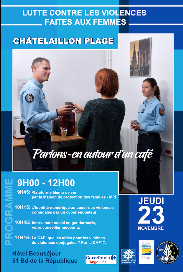 Le groupement de gendarmerie de la Charente-Maritime se mobilise dans le cadre de la lutte contre les violences faites aux femmes et propose un forum ce matin à Châtelaillon-Plage. À cette occasion, la Maison de la protection des familles présentera la plateforme Mémo de Vie, un outil digital qui permet aux personnes victimes de garder une trace des événements, accéder à des ressources fiables et stocker des éléments qui pourraient faciliter un éventuel dépôt de plainte et une enquête. Un cyber-enquêteur expliquera également comment créer une nouvelle identité numérique pour que l’ex-conjoint ne puisse plus suivre sa victime, et comment détecter une application espion ou un traceur.