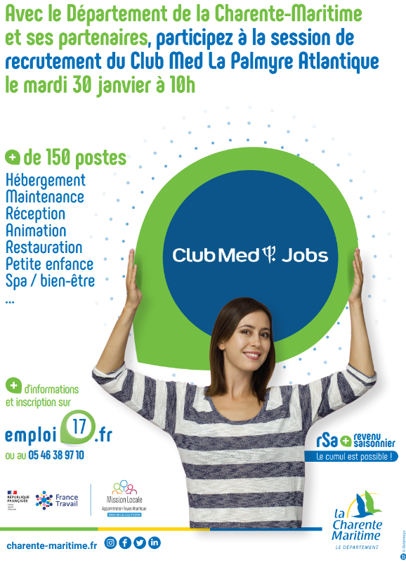 Plus de 150 postes à pourvoir ce matin au Club Med La Palmyre Atlantique aux Mathes, près de Royan. Une session de recrutement de saisonniers a lieu ce mardi, de 10h à 12h30, au sein du village vacances. Des emplois sont proposés dans divers domaines : l’hébergement, la maintenance, la réception, l’animation, la restauration ou encore la petite enfance. Il faut se présenter avec un CV.