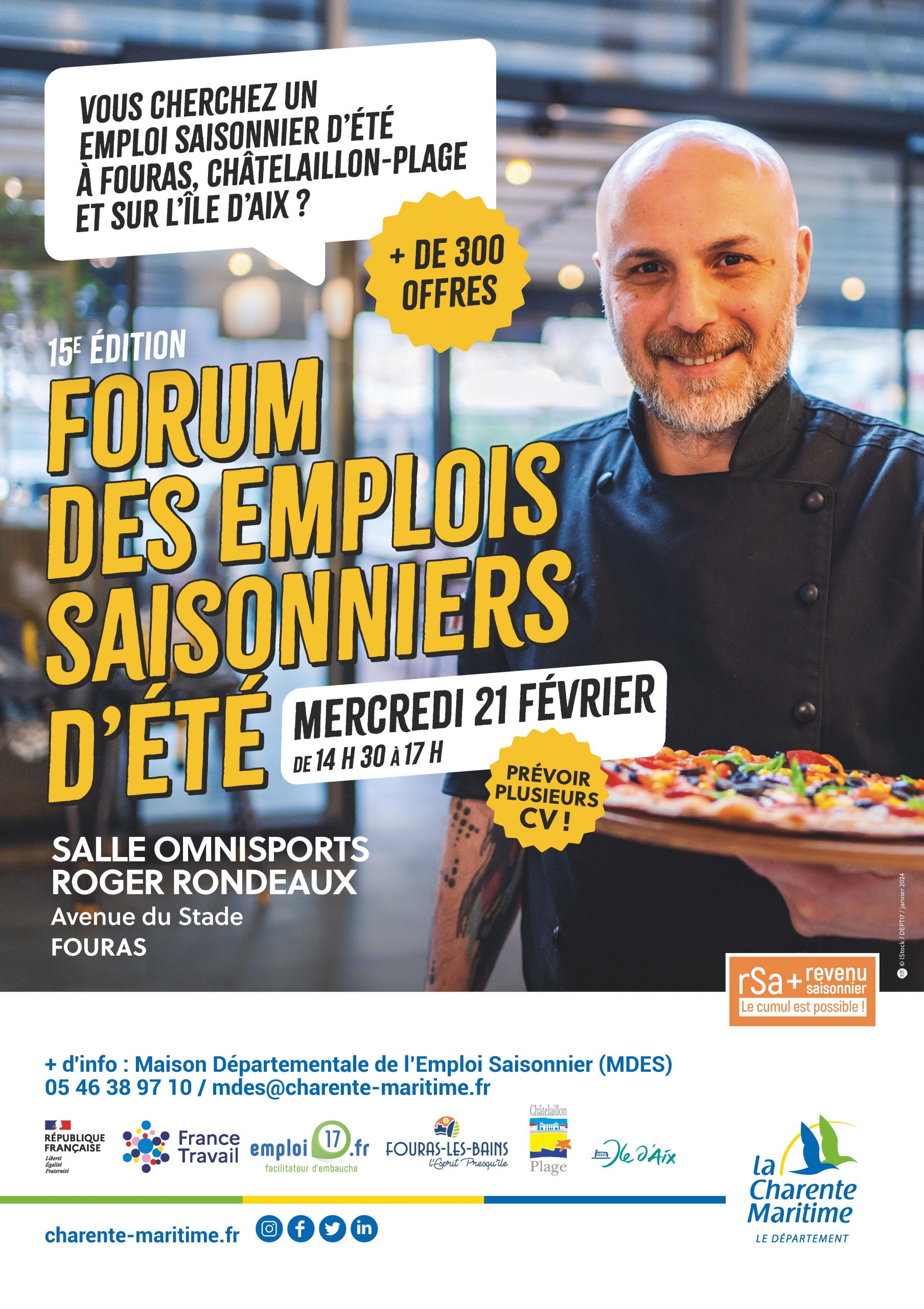 En amont du forum, les candidats auront la possibilité de participer gratuitement, sur inscription, à un atelier de présentation des métiers saisonniers au Village Vacances AZUREVA de Fouras, le jeudi 15 février à 14 h30. Rendez-vous sur emploi17.fr ou contactez-le 05 46 38 97 10.