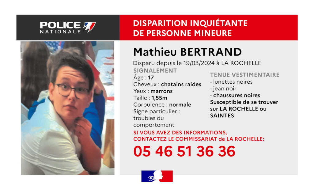 La police nationale de la Charente-Maritime lance un appel à témoins après la disparition inquiétante d’un jeune homme de 17 ans à La Rochelle. Il s’agit de Mathieu Bertrand qui n’a plus donné de nouvelles à ses proches depuis mardi dernier, après avoir quitté le Lycée maritime et aquacole où il était scolarisé. L’adolescent, qui souffre de troubles du comportement, serait parti avec un sac poubelle contenant ses affaires. Il a les cheveux châtains, les yeux marrons, il mesure 1,55m. Le jour de sa disparition, il portait un jean noir, des chaussures noires et des lunettes noires. Il pourrait se trouver à La Rochelle ou Saintes. Si vous avez des informations, vous pouvez contacter le commissariat de La Rochelle au 05 46 51 36 36.