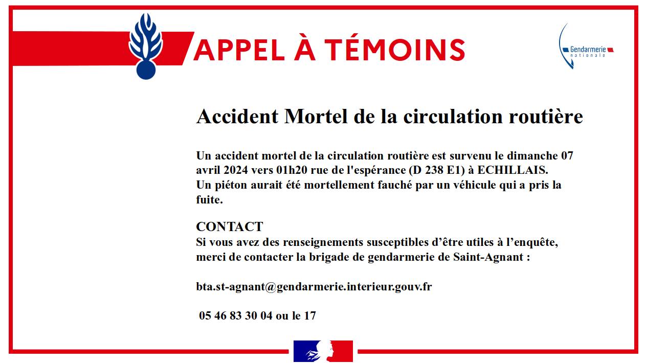 La gendarmerie de la Charente-Maritime a lancé hier un appel à témoins après un accident mortel survenu à Échillais, au sud de Rochefort. Un piéton âgé de 25 ans est décédé dans la nuit de samedi à dimanche sur la D 238. Vers 1h20 du matin, la victime a été mortellement fauchée par un véhicule qui a pris la fuite. Une enquête a été ouverte, et les gendarmes recherchent des témoins qui auraient assisté à la scène. Si vous avez des renseignements, vous pouvez contacter la gendarmerie de Saint-Agnant au 05 46 83 30 04.