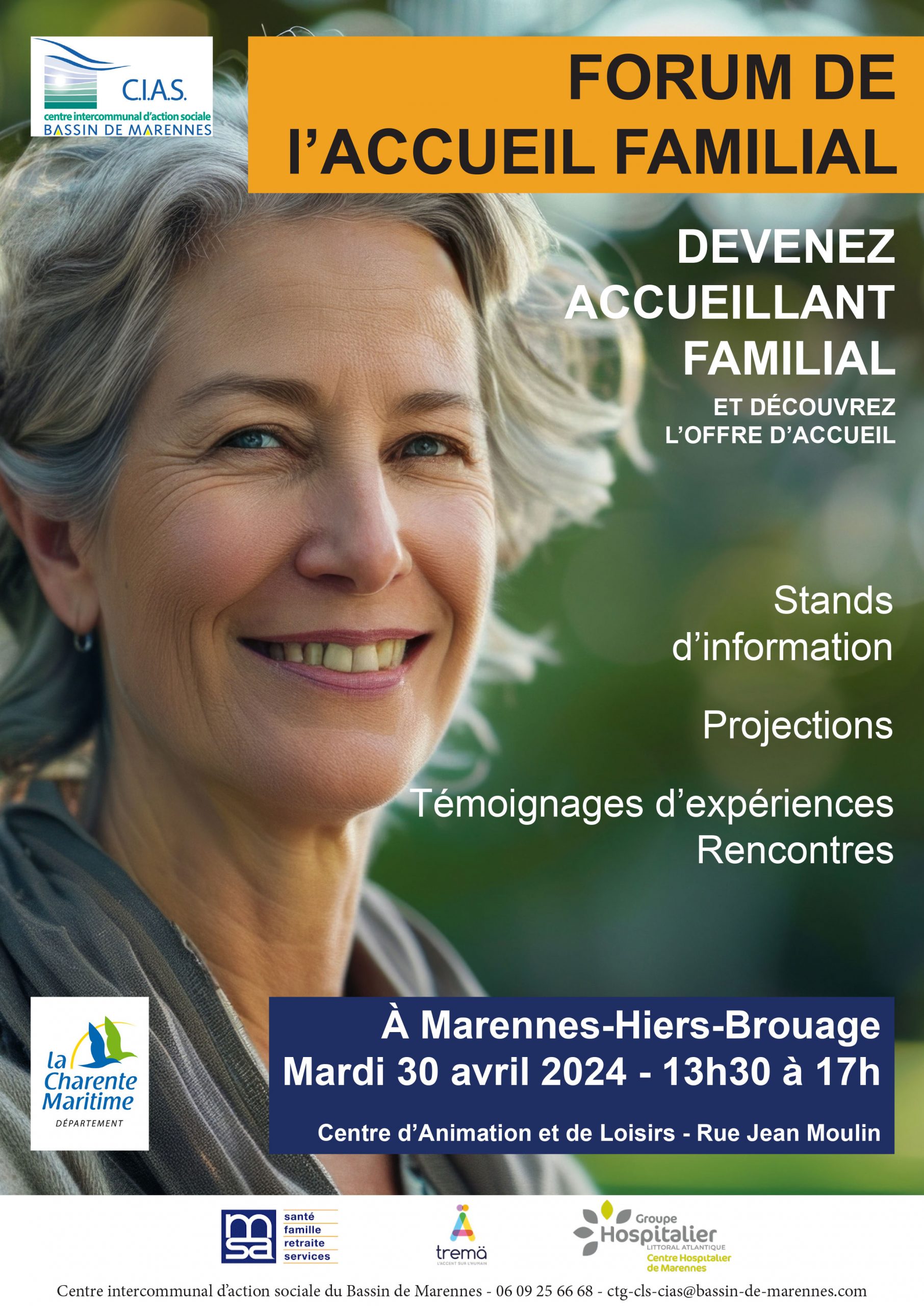 Afin de mieux faire connaître cette activité et les démarches pour devenir accueillant familial, le forum proposera des stands d’information, des projections vidéos, des rencontres et des échanges avec des accueillants familiaux. Seront notamment présents : le service de soins infirmiers à domicile TRËMA, le service d’accueil de jour de l’EHPAD de Marennes, et la Mutualité Sociale Agricole des Charentes.