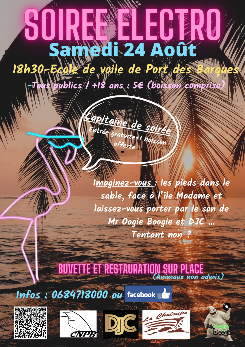 À Port-des-Barques, l’école de voile vous invite une nouvelle fois, sur la plage, à une soirée électro samedi 24 août, à 18h30. Face à l’île Madame, profitez du son de Mr Oogie Boogie et DJC. Buvette et restauration sur place. Tous publics. 5€ boisson comprise. Entrée gratuite et une boisson offerte pour le capitaine de soirée. Renseignements au 06 84 71 80 00 et sur Facebook.