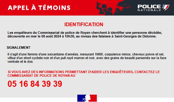 La police de Royan lance un appel à témoins pour identifier le corps d’une personne retrouvé en mer la semaine dernière. C’était jeudi, près des falaises de Saint-Georges-de-Didonne. Il s’agit d’une femme âgée d’une soixantaine d’années, mesurant 1,60m, les cheveux poivre et sel, de corpulence mince, avec plusieurs grains de beauté sur le ventre et le dos. Elle portait un short cycliste noir et un pull rayé marron et noir. Si vous avez des informations, vous pouvez contacter le commissariat de Royan au 05 16 84 39 39. L’autopsie doit avoir lieu demain.