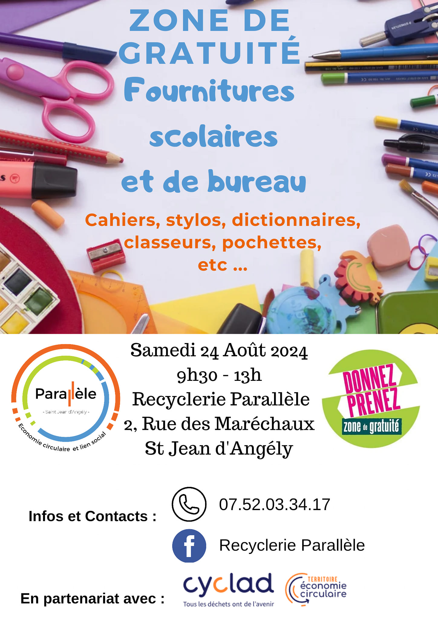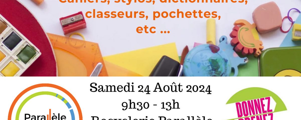 La rentrée, c’est dans un peu moins de deux semaines. Et si ce n’est pas déjà fait, il est grand temps de penser aux fournitures scolaires. Mais avant de vous ruer dans les rayons des supermarchés, pensez à faire le tri avec vos enfants. À Saint-Jean-d’Angély, la Recyclerie parallèle propose cette année encore une zone de gratuité spéciale fournitures scolaires et de bureau, pour donner et prendre ce que vous voulez. Ce sera samedi matin. Nathalie Barré-Liotard, responsable de l’association, nous en parle :
