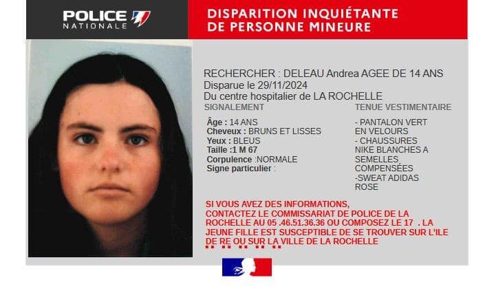 La police de la Charente-Maritime a lancé un appel à témoins hier après la disparition inquiétante d’une adolescente de 14 ans. Andréa Deleau a disparu vendredi dernier du centre hospitalier de La Rochelle. Elle mesure 1,67m, a les yeux bleus et elle est de corpulence normale. Elle portait un pantalon vert en velours, une paire de chaussures Nike blanches à semelles compensées et un sweat Adidas rose. Elle est susceptible de se trouver sur l’île de Ré ou à La Rochelle. Si vous avez des informations, vous pouvez contacter la police de La Rochelle au 05 46 51 36 36 ou le 17.