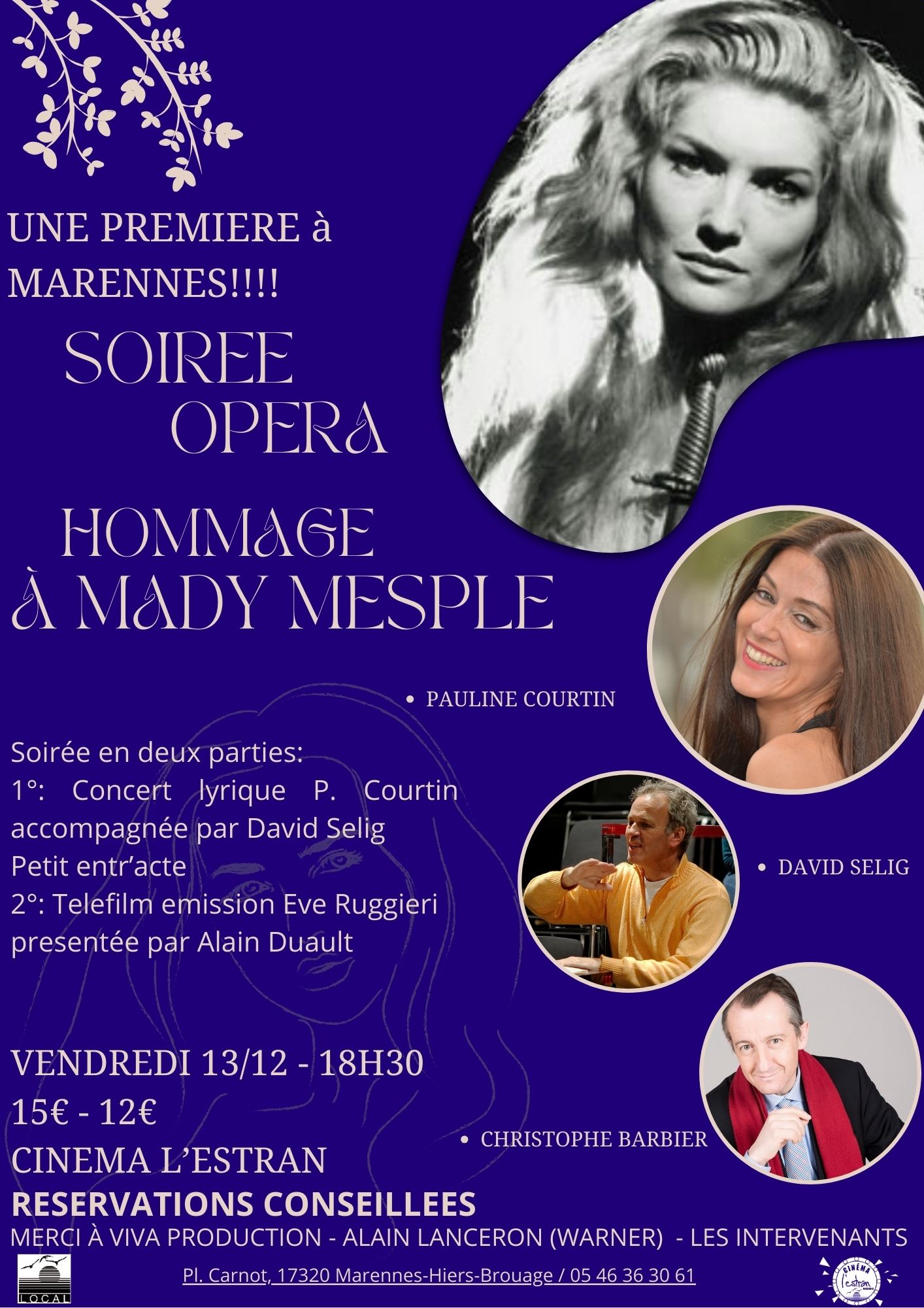 Le cinéma l’Estran de Marennes rend hommage ce soir à Mady Mesplé, grande cantatrice française des années 70, décédée en 2020 à l’âge de 89 ans. Sa sœur Giselle est à l’initiative de cette soirée opéra en deux étapes présentée par l’éditorialiste politique Christophe Barbier. Un concert de la soprano Pauline Courtin, qui fut élève de Mady Mesplé, sera proposé à 18h30, suivi d’un téléfilm de Ève Ruggieri produit pour les 80 ans de l’artiste.