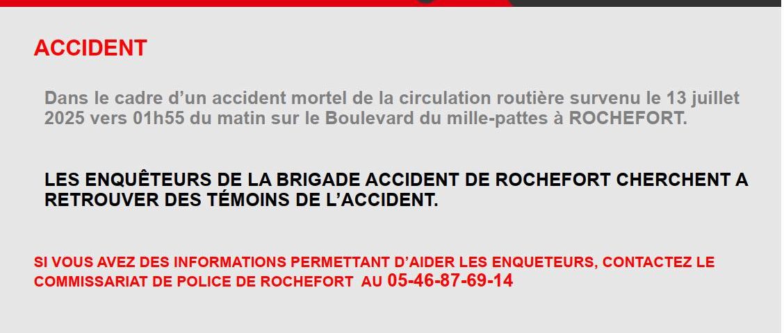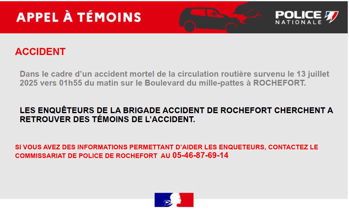 La police nationale de la Charente-Maritime a lancé un appel à témoins hier, après l’accident mortel survenu dans la nuit de samedi à dimanche à Rochefort. Peu avant 2h du matin, deux voitures sont entrées en collision sur le boulevard du Mille-pattes. Le bilan est dramatique : deux femmes de 18 et 50 ans sont décédées. Une femme de 72 ans a été grièvement blessée, ainsi qu’un jeune homme de 25 ans. Un homme de 76 ans a été plus légèrement touché. Et quatre personnes ont été très choquées. Une enquête a été ouverte. La brigade accident de Rochefort cherche à retrouver d’éventuels témoins. Si vous avez des informations, vous pouvez contacter le commissariat au 05 46 87 69 14.