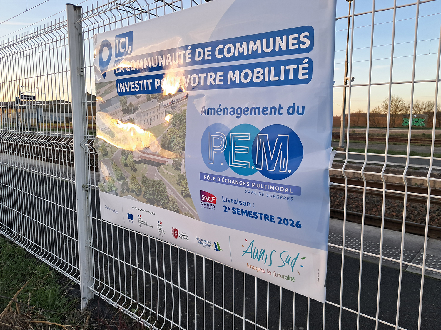 Les travaux du futur Pôle d’échanges multimodal à la gare de Surgères vont bon train. Lancés en janvier dernier, ils devraient s’achever comme prévu dans un peu plus d’un an. Après l’été, débutera une phase importante du chantier, porté par la Communauté de communes Aunis Sud, avec la création d’une passerelle et d’un giratoire sur la RD 939 bis qui sera fermée, à cette occasion, du 20 août jusqu’à la fin du chantier. Une déviation sera mise en place, et l’accès à la gare et aux commerces sera maintenu. On écoute Guillaume Brivio, responsable de la communication à la CdC Aunis Sud :