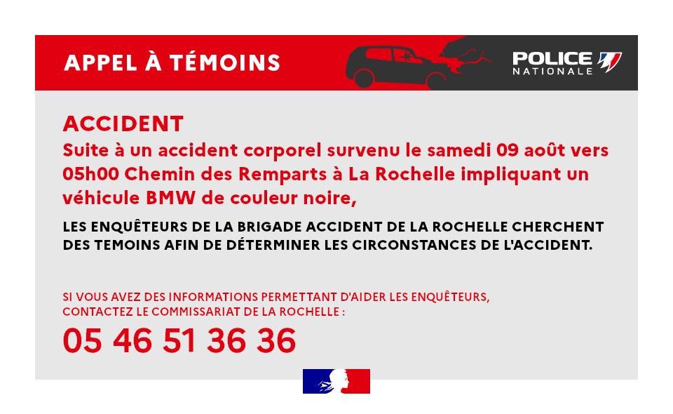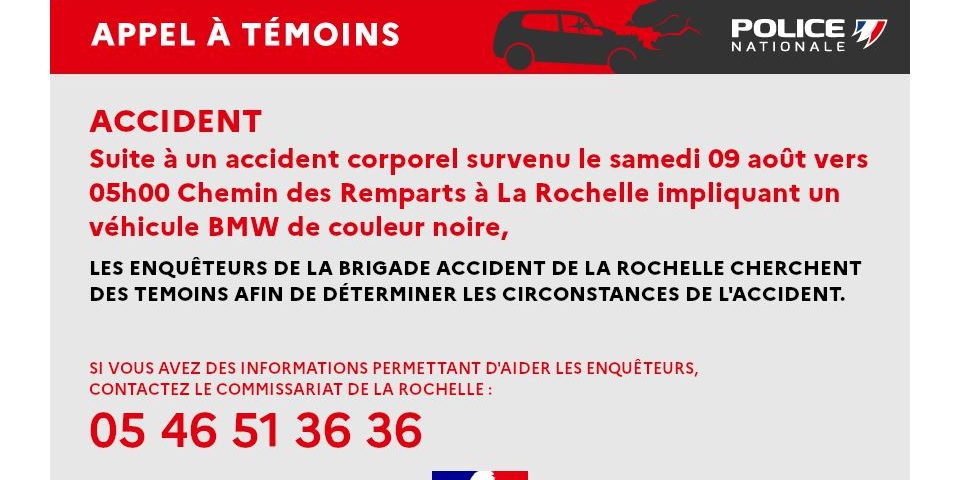 La police nationale de la Charente-Maritime lance un appel à témoins après un accident survenu samedi vers 5h du matin Chemin des Remparts à La Rochelle. Un accident impliquant un véhicule BMW de couleur noire. Les enquêteurs cherchent à en déterminer les circonstances. Si vous avez des informations, vous pouvez contacter le commissariat de La Rochelle au 05 46 51 36 36.