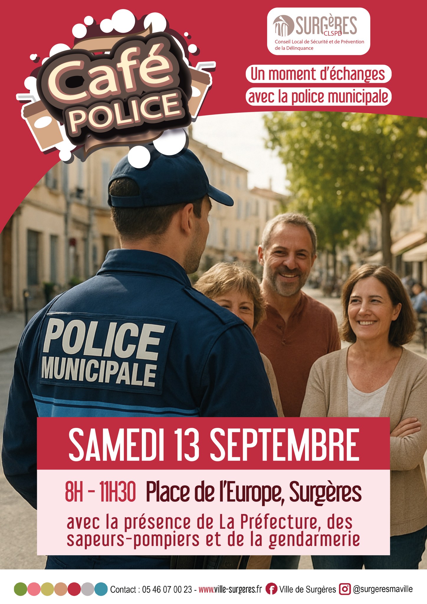 « Café police ». C’est le nouveau rendez-vous proposé par la Ville de Surgères samedi prochain, dans la matinée, en centre-ville. Un temps d’échange avec la police municipale, en présence de la gendarmerie, des sapeurs-pompiers et de la Sécurité routière. L’occasion pour le public de rencontrer les agents directement dans la rue, pour aborder différents sujets ou problématiques liés à la sécurité, à la prévention et à la délinquance, comme l’explique Stéphane Auger, adjoint au maire de Surgères :