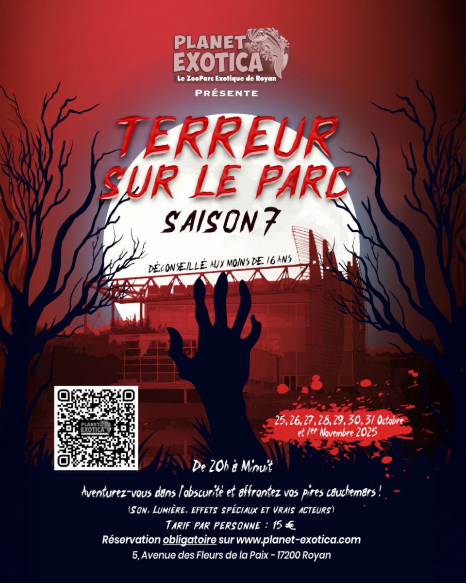 Cette semaine, venez frissonner à Planet exotica Royan et gagnez des pass pour 2 personnes à l’évènement Halloween « Terreur sur le parc ». Du 25 au 31 octobre et le 1er novembre, entre 20h et minuit, aventurez-vous dans l’obscurité et affrontez vos pires cauchemars sur le parcours de l’horreur, avec son, lumière, effets spéciaux et de vrais acteurs. Attention, animation déconseillée aux moins de 16 ans.
