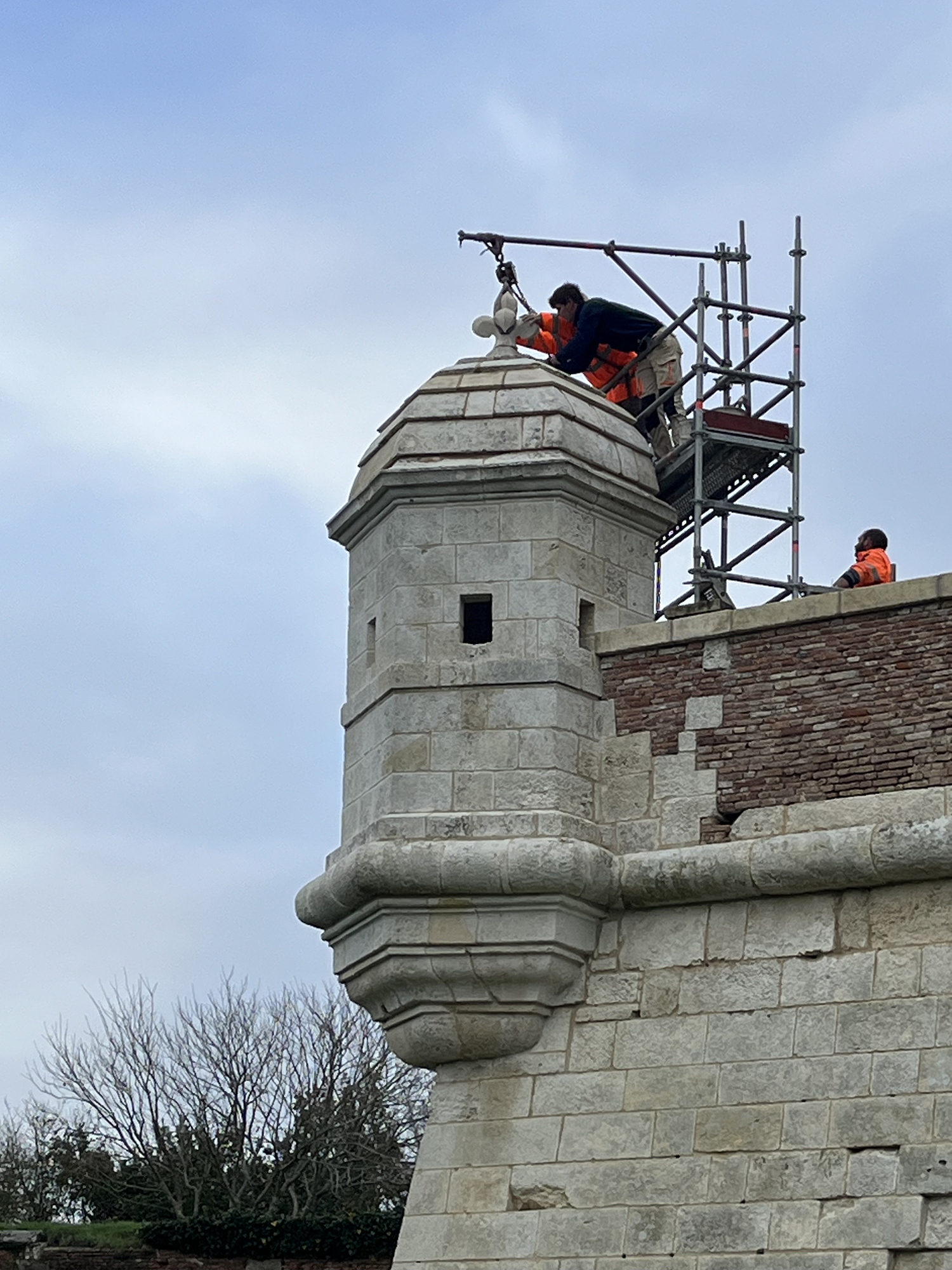 La pose vendredi dernier à la citadelle de Brouage de la première fleur de lys sur l’échauguette du bastion d’Hiers, à l’entrée sud de la place forte. Cette étape s’inscrit dans le programme de préservation et de restauration des remparts du site entre 2022 et 2026, pour un coût total de 9 millions d’euros. Après la réhabilitation des principaux monuments comme la Halle aux vivres, la tonnellerie, la poudrière et l’église, il a été décidé d’intervenir sur les remparts qui ont été endommagés par le temps et qui n’ont jamais été restaurés. L’objectif étant de redonner tout son lustre royal à l’échauguette du bastion d’Hiers, ayant perdu sa fleur de lys depuis plusieurs années, comme le souligne Catherine Desprez, présidente du Syndicat mixte pour la restauration et l’animation du site de Brouage… Attention, tendez l’oreille, il y avait beaucoup de vent…