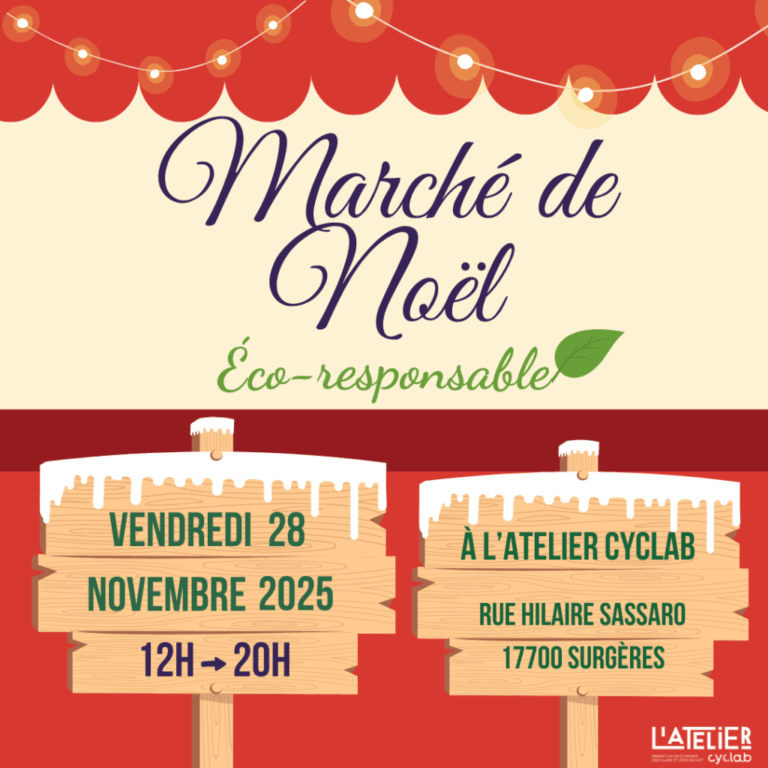 Rendez-vous de 12h à 20h à l’Atelier Cyclab, dans la zone industrielle Ouest de Surgères. Des ateliers gratuits seront proposés : illumination du vélo-sapin, création LEGO sur le thème de Noël, restauration zéro déchet et concert du groupe Tadâm à 18h et 19h.