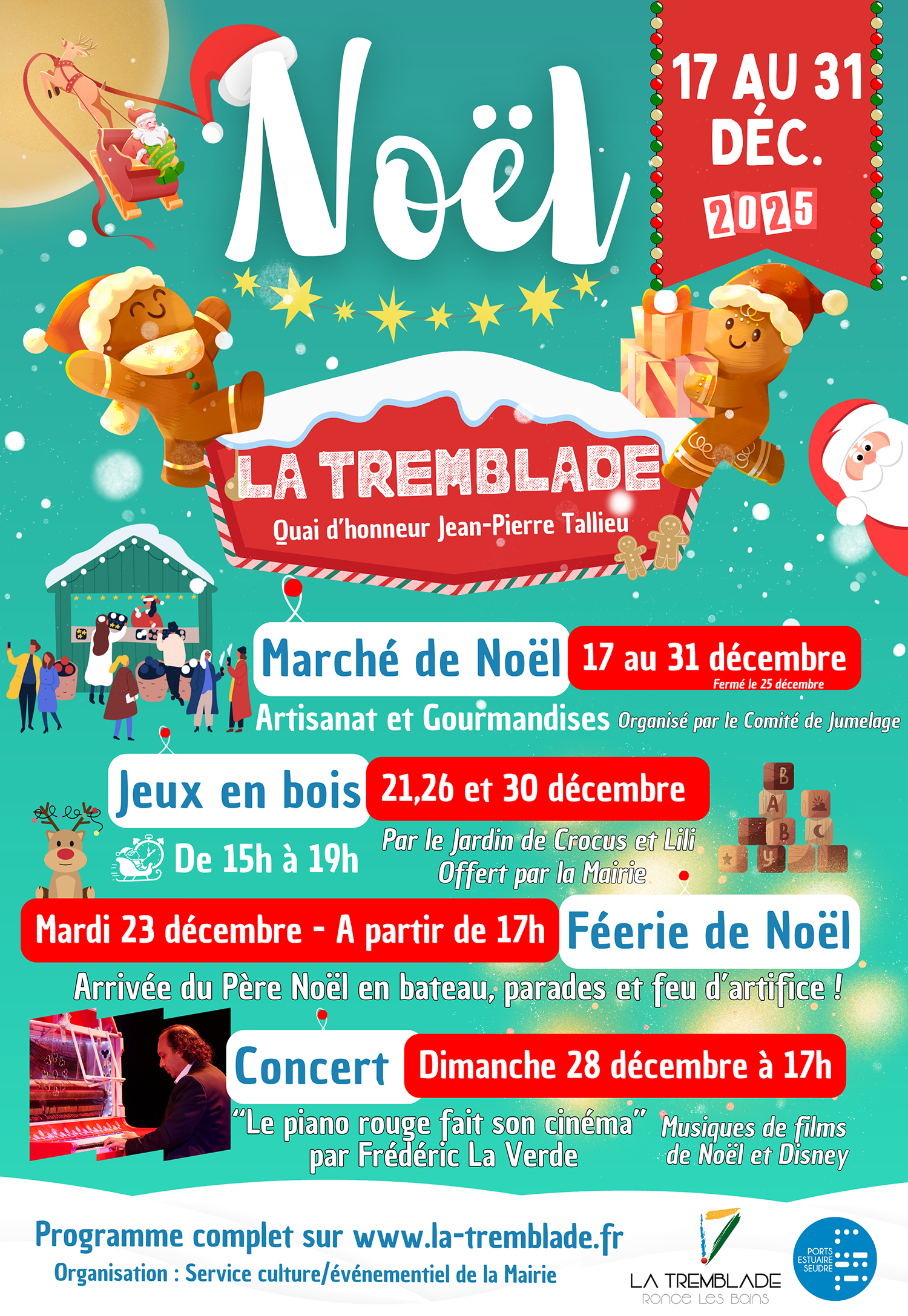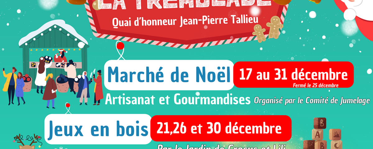 La magie de Noël s’installe à La Tremblade du 17 au 31 décembre. Venez découvrir le Marché de Noël, organisé par le Comité de Jumelage et la mairie, sur le quai d’honneur du port, regroupant des chalets d’artisans et de commerçants où vous trouverez de nombreuses idées de cadeaux pour les fêtes. Produits régionaux, bijoux, cosmétiques, peintures, photos… Sans oublier le stand de crêpes et boissons chaudes pour une pause gourmande.